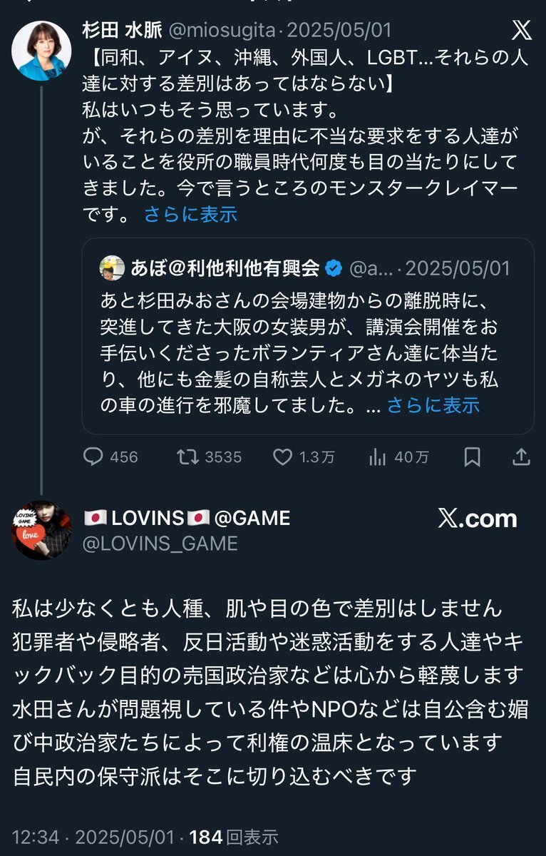 返信先:@miosugita私は少なくとも人種、肌や目の色で差別はしません 犯罪者や侵略者、反日活動や迷惑活動をする人達やキックバック目的の売国政治家などは心から軽蔑します 水田さんが問題視している件やNPOなどは自公含む媚び中政治家たちによって利権の温床となっています 自民内の保守派はそこに切り込むべきです