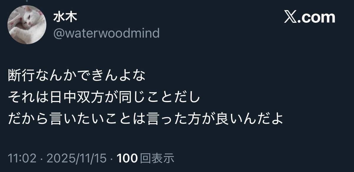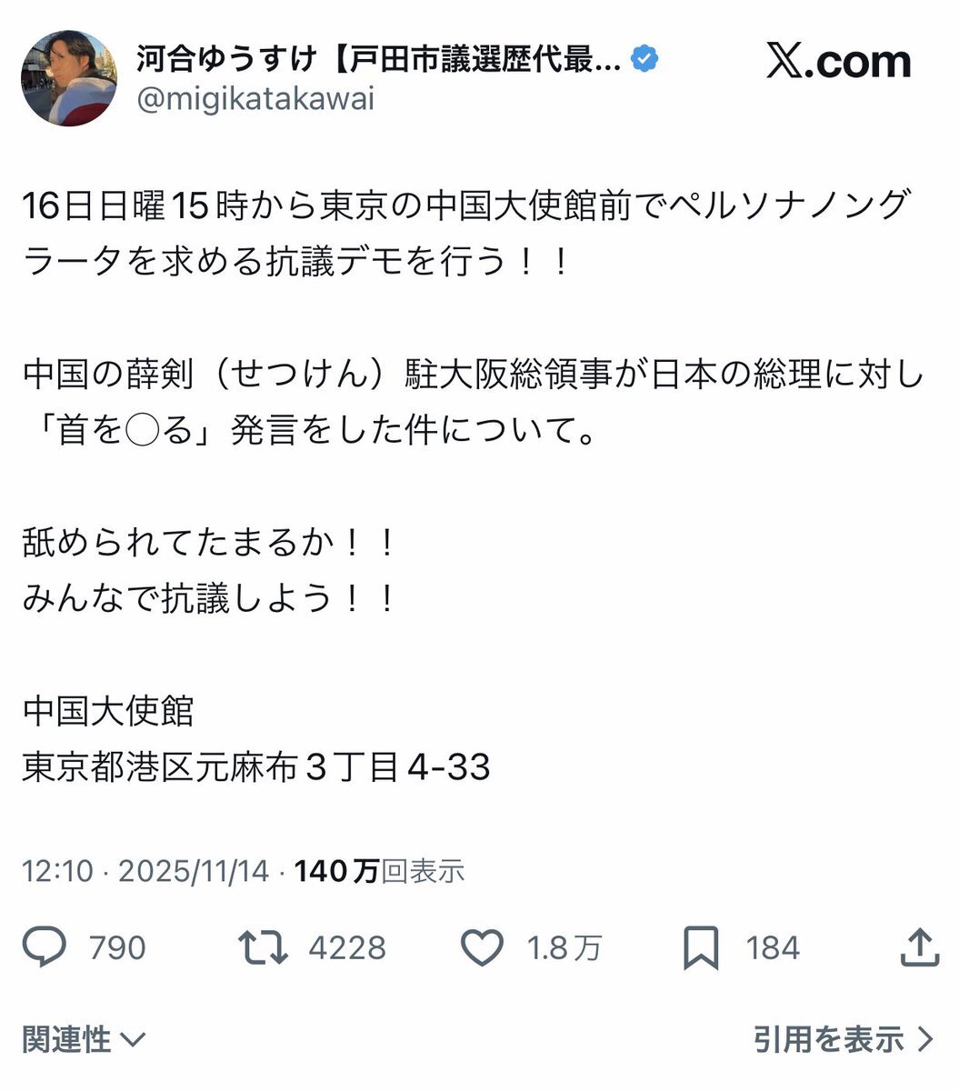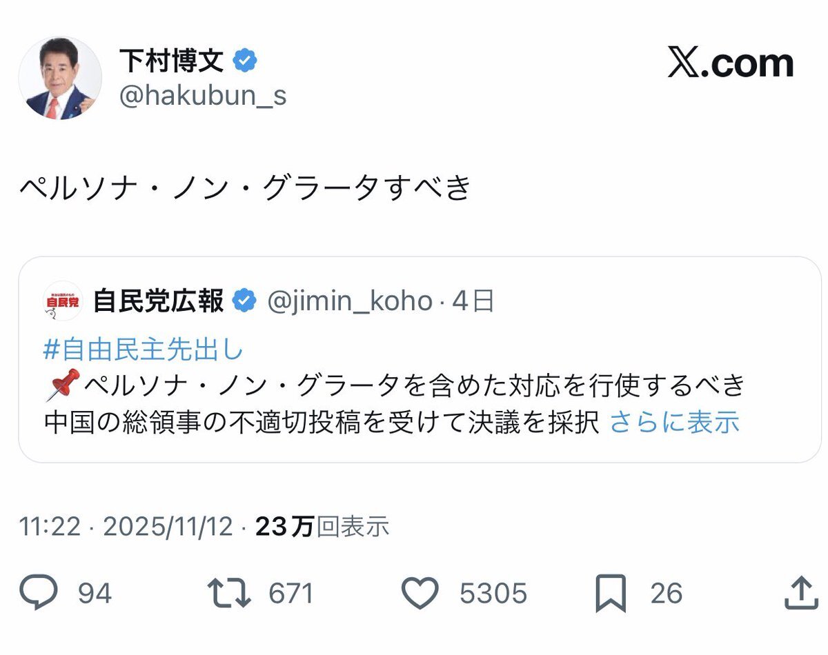 ❌高市総理は発言を撤回すべき、さもないと日本がすべての責任 ⭕️中国政府は領事を撤回すべき、さもないと中国がすべての責任 長年、中韓ウォッチングをしているとわかるが、彼らは自分たちが全面的に悪いときにこそ、相手が悪いかのごとくふるまう。 この問題、一歩も引いてはならない。 x.com/nikkei/status/…