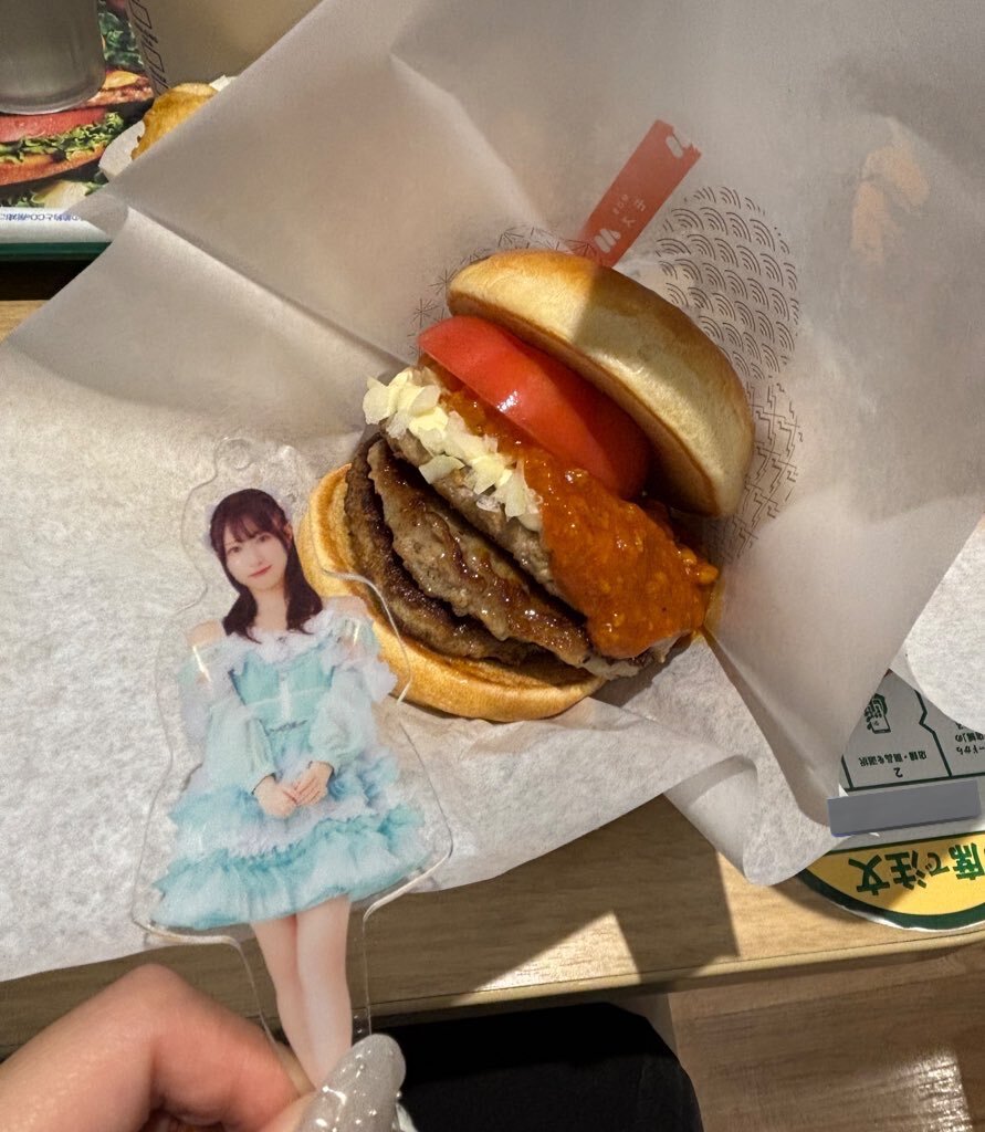 返信先:@mos_burgerノイミーちゃんとのコラボありがとうございます💎♡黒毛和牛とっても美味しかったです(⸝⸝⸝ᵒ̴̶̷ ⌑ ᵒ̴̶̷⸝⸝⸝) 鈴木瞳美ちゃんのアクスタ当たりますように🪄︎︎🎀 #ノイミーの今夜はもぐもぐ肉モス