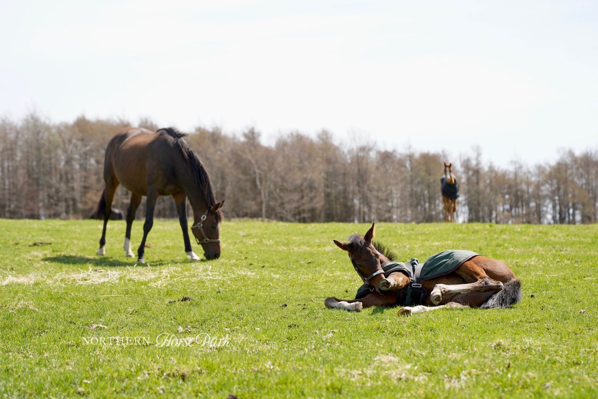 2020年のアイルランド府中牝馬(GⅡ)を優勝し、同年のエリザベス女王杯や有馬記念でも好走したサラキアが元気な女の子を出産しました。春の絨毯を心地良さそうに満喫する仔馬の横で、春の味覚を堪能するお母さん。親子それぞれの春を満喫しています。 #ノーザンファームからのお便り #サラキア pic.x.com/mBnlAhW6Rm