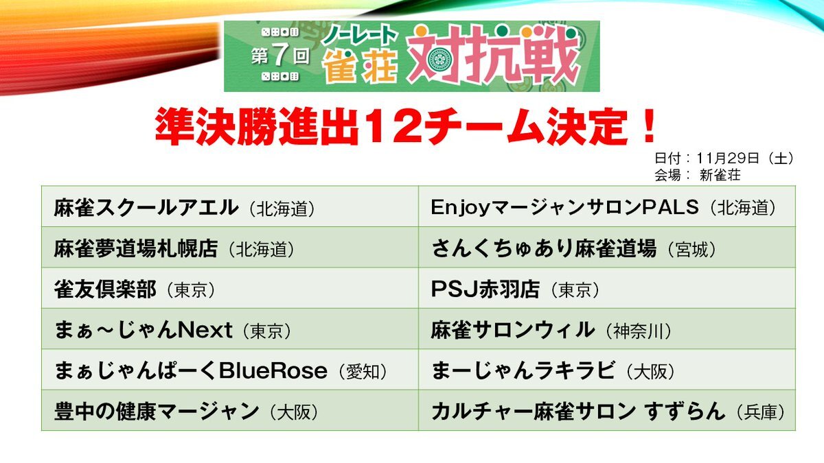 / 📢【第7回ノーレート雀荘対抗戦】   準決勝進出チーム決定‼️ \ 本日の予選会をもちまして、今月29日に東京で行われる準決勝進出チームが全て出揃いました。 予選を突破された各チームの皆様、おめでとうございます🎊 準決勝は上位4チームが翌日の放送対局で行う決勝へ進出です❗️