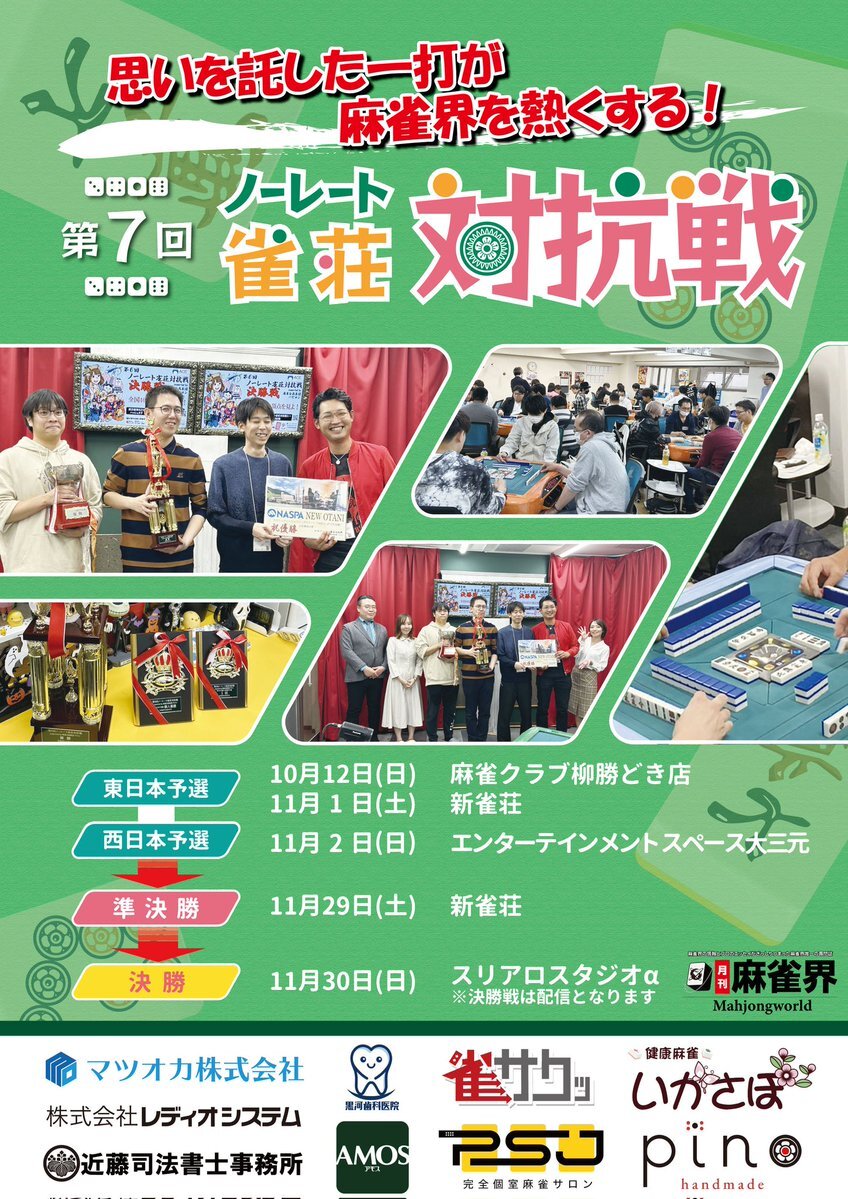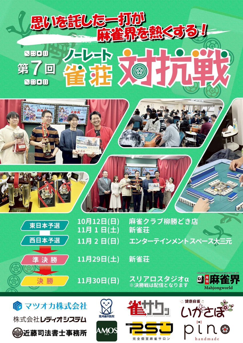 【第7回ノーレート雀荘対抗戦】 10月12日(日)東日本予選①より開幕❗️ 11月1日(土)東日本予選②・11月2日(日)西日本予選・11月29日(土)準決勝と続き… 閉幕は11月30日(日)決勝の配信対局‼️@スリアロαスタジオ 各店舗様の選考は、普段の成績や選考会の実施など様々🔥 リポストよりご確認ください🙇