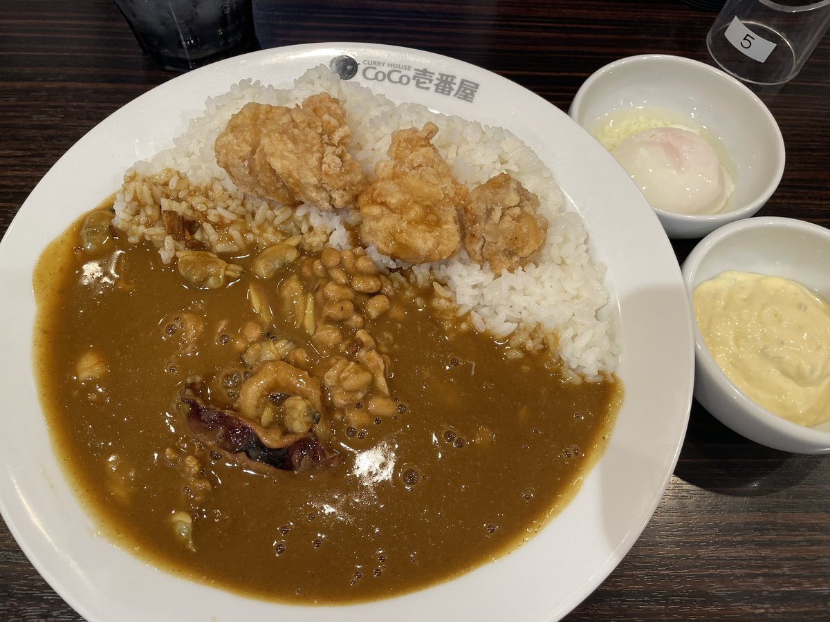 高城れにさんがInstagramで紹介していた CoCo壱の「海の幸カレー4辛、ご飯150g、納豆・タルタル・半熟卵トッピング」 を参考に ご飯を400gにしフライドチキン3個追加! 激ウマでハマりました。 次は辛さをもっと増したい。 #CoCo壱 #ハマスカ放送部 #高城れに pic.x.com/5YTgJ7f76j