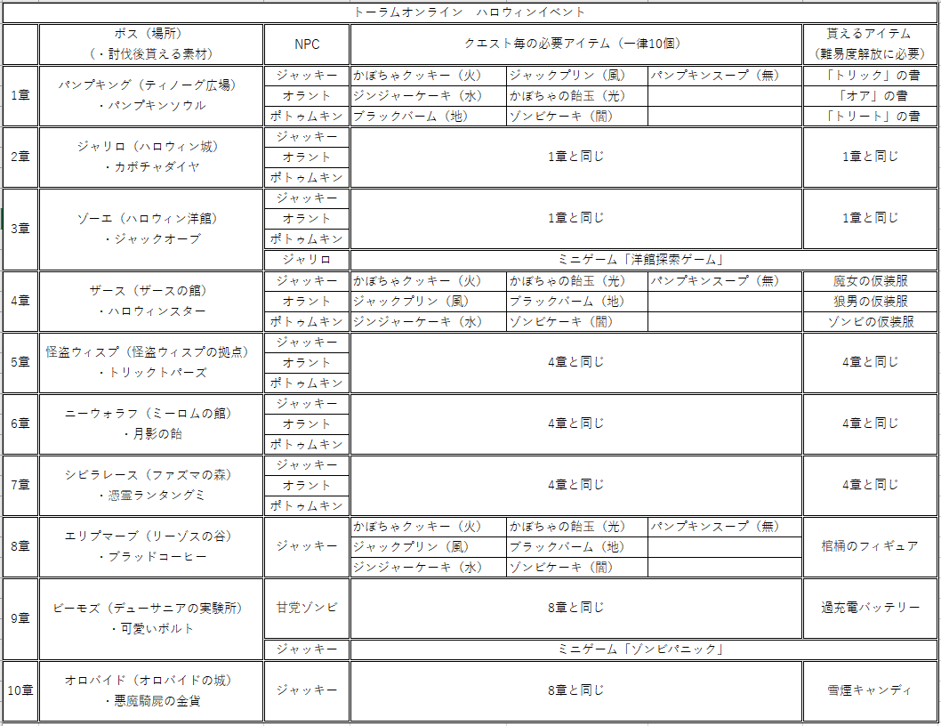 トーラムオンラインのハロウィンイベント 何章にどのボスが居るのか毎回迷子になるので、素材も含めてまとめてみました。たぶん合ってるはず 来年も使えるといいなあ #トーラムオンライン #ハロウィンイベント pic.x.com/6E4nBkwGIq