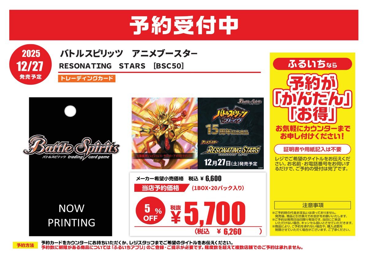 / 📢トレカ予約受付中‼️ \ 12/27発売予定 バトルスピリッツ アニメブースター RESONATING STARS ご予約受付中です‼️ ご来店お待ちしております🙇♂️ #ふるいち #本庄早稲田店 #バトルスピリッツ pic.x.com/M4DaJ3SA5J