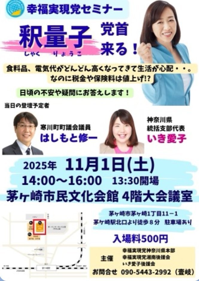 神奈川の皆さん~📣 11月1日(土)、神奈川県茅ヶ崎市に、#幸福実現党 釈党首がまいります🥰 どうぞお気軽にご参加ください❗️ #全ての増税に反対 #バラマキは増税のもと x.com/shuchuan_HRP/s…