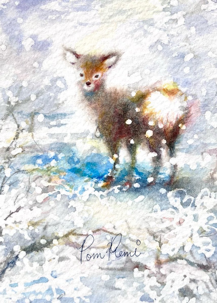 雪バンビ❄️ 水彩画 ふわふわおしり🦌 ※名刺サイズぐらいとても小さな絵です。 今週もがんばります🐾 #絵描きさんと繫がりたい #アナログ絵 #水彩画 #絵画 #イラスト #雪 #冬 #鹿 #シカ #子鹿 #バンビ #動物画 #artwork #watercolorart #illustration #fawn pic.x.com/GezThmfSur