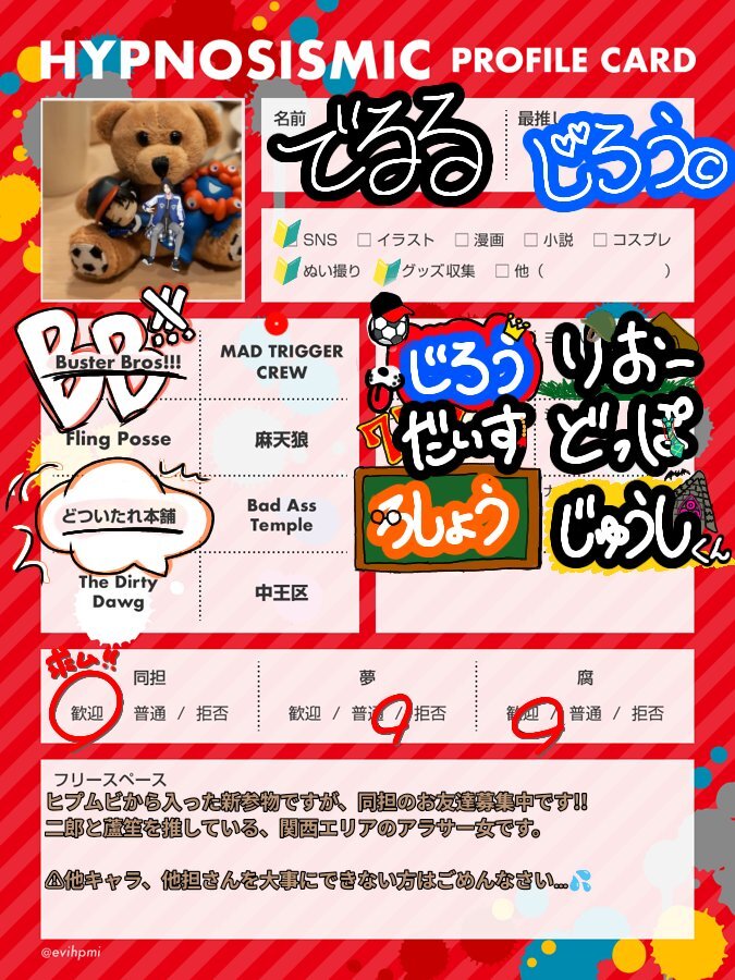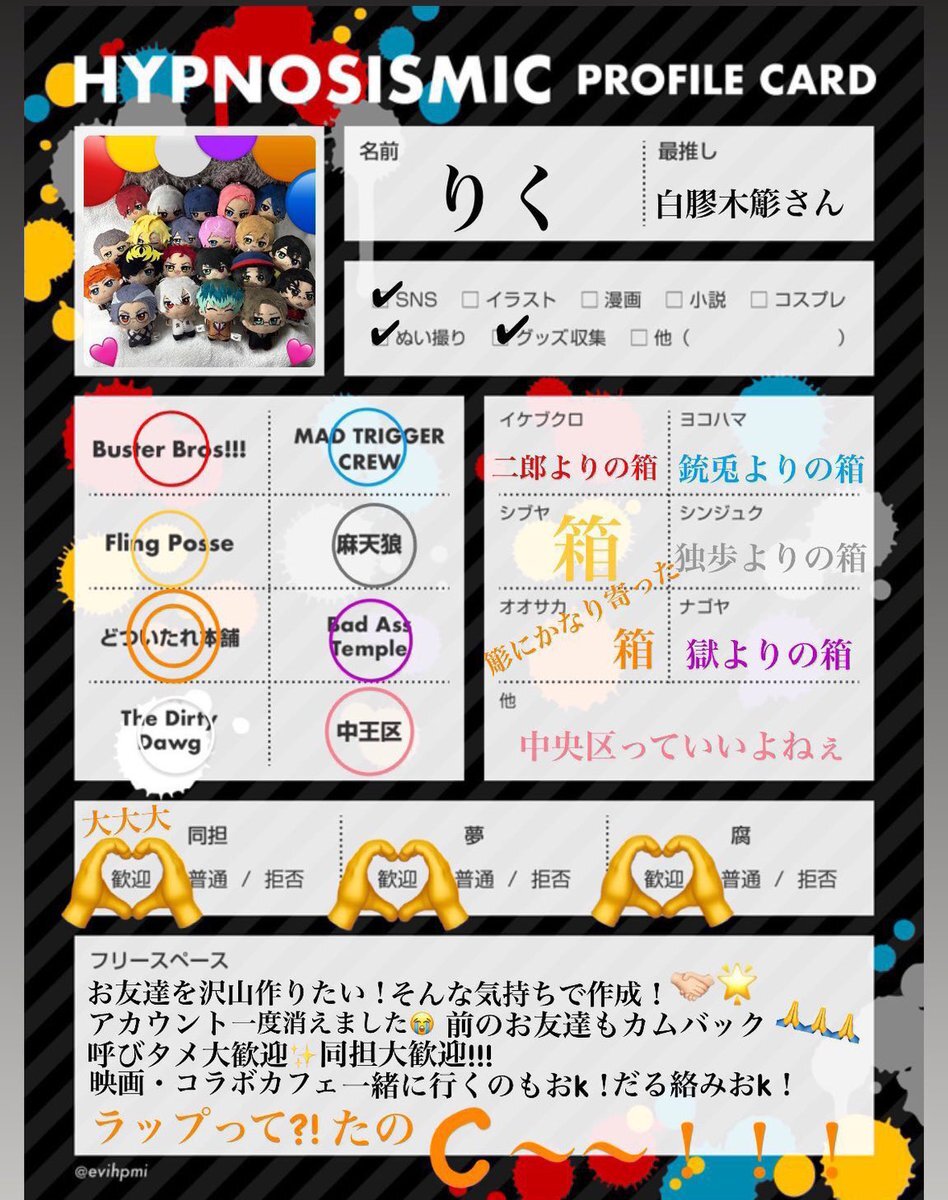 10月なので🆕募集! 多くのヒプマイヘッズと仲良くなりたい!を掲げ、男女問わず輪を広げたい✨️ 呼びタメ・グッズ交換等幅広く対応出来ます👍✨ ♡等反応頂ければゆっくりお迎えします🐌 (無言フォローもあるかも🙇♂️) #ヒプマイ好きと繋がりたい #ヒプマイ自己紹介カード pic.x.com/jWCGkbIqvC