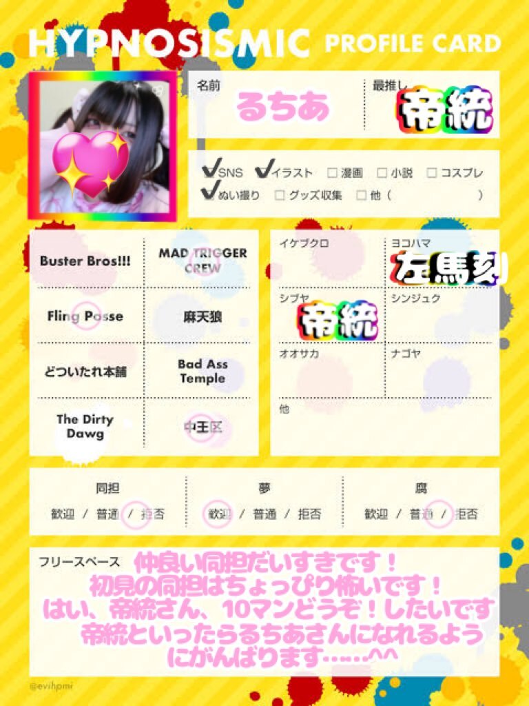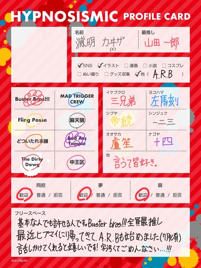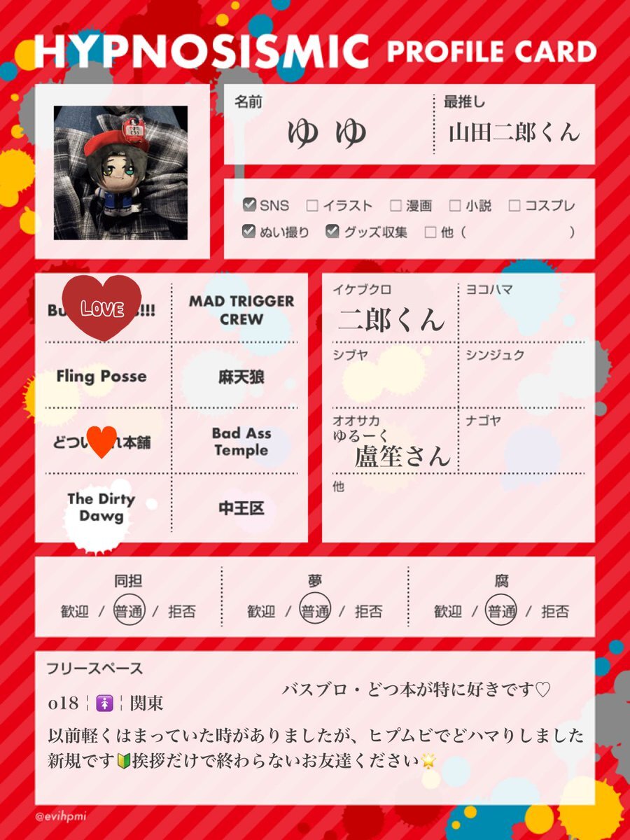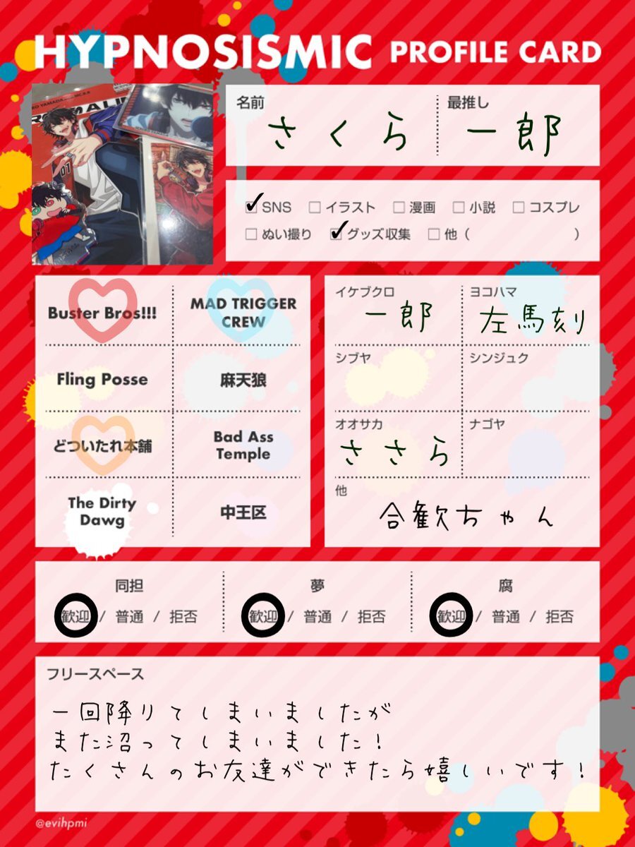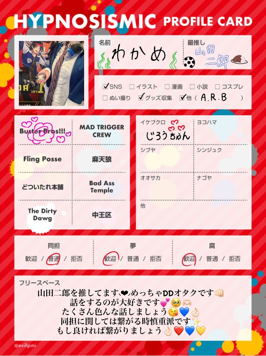 今更ですが、ヒプマイのプロフィールカード書きました🖊️ 10月ブクロに会える機会が多いので、 ブクロを一緒に応援できるお友達が欲しい…🥹✨ 蘆笙センセも好きなのです… 二郎と蘆笙贔屓の箱推しですので、 他担様も歓迎🌸 #ヒプマイ好きな人と繋がりたい #山田二郎 #ヒプマイ11thライブ #ヒプステ