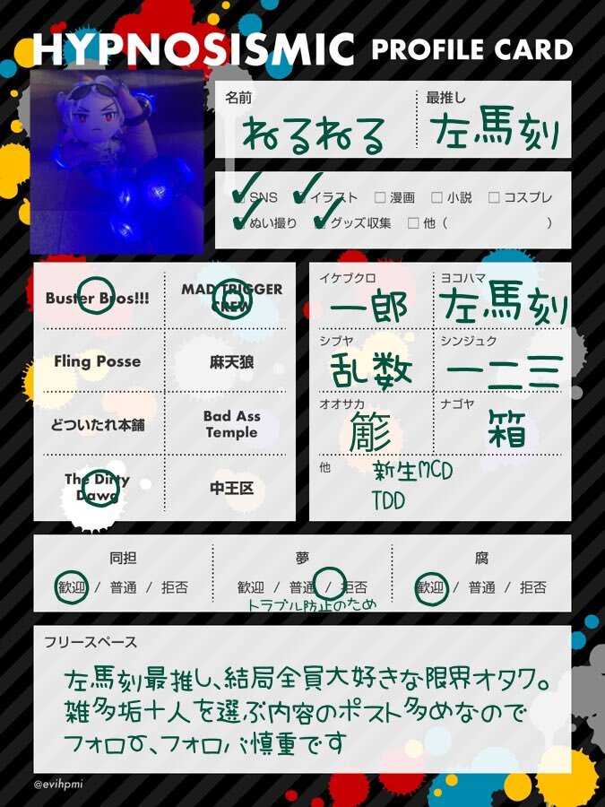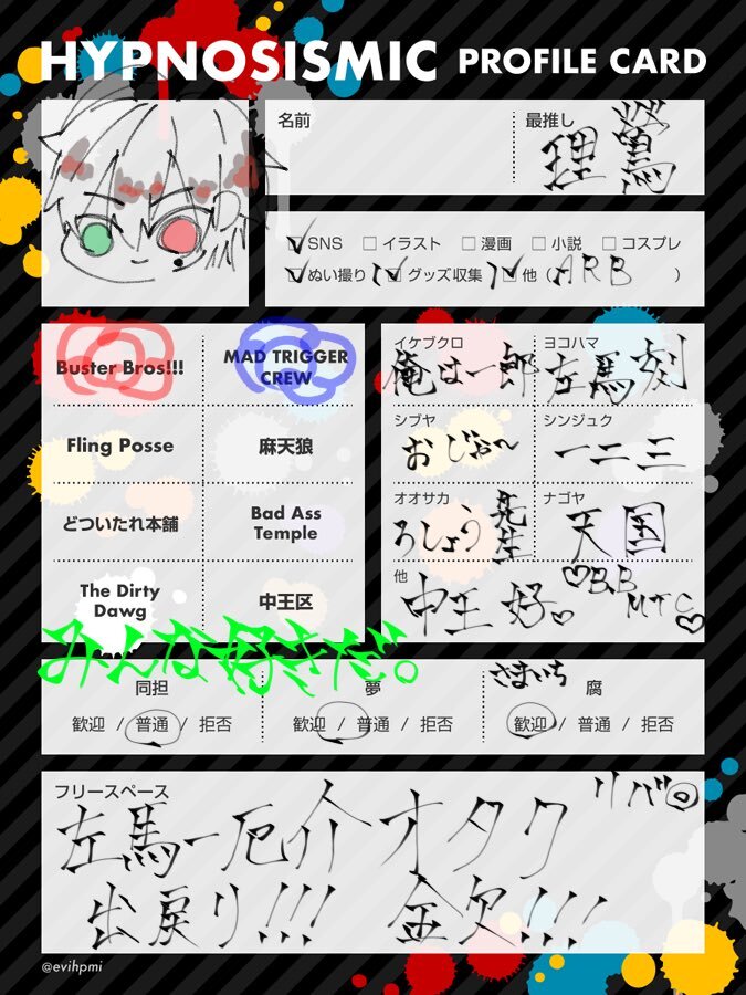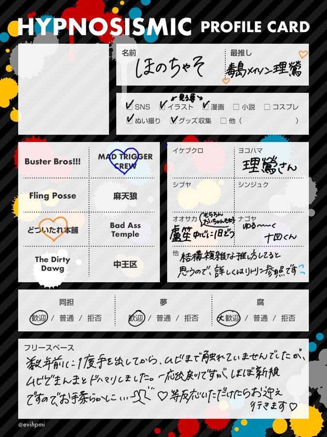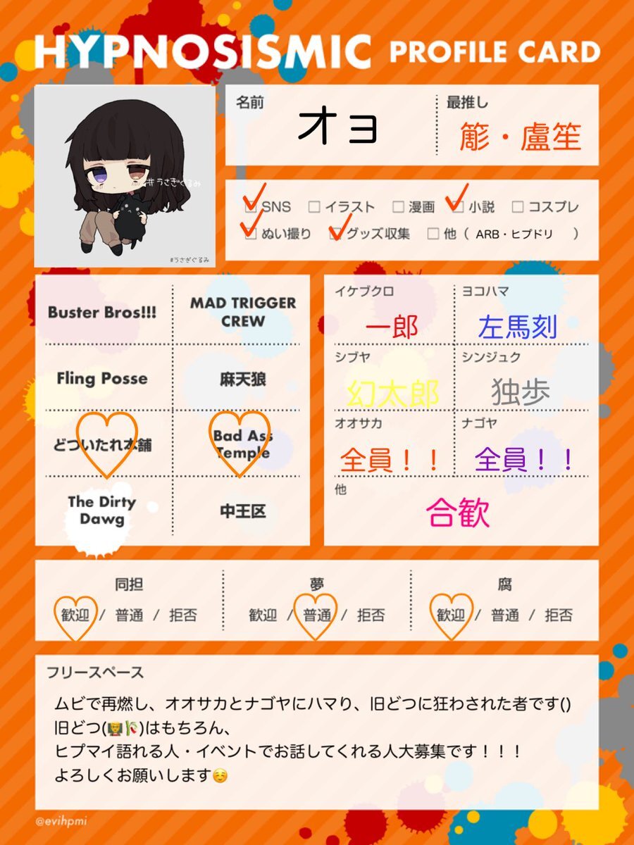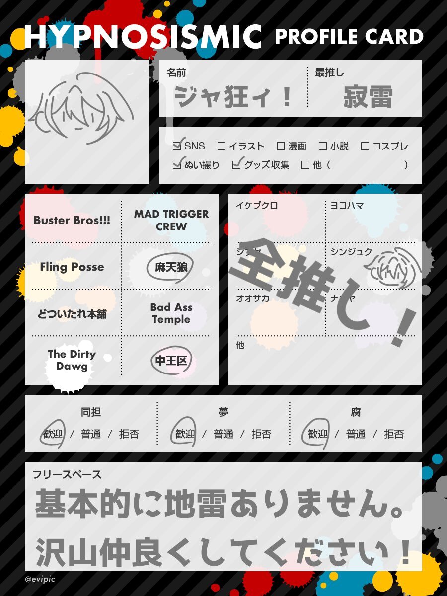 自己紹介カードをお借りして作成しました! ヒプマイ新参者ではございますが、よろしくお願いします! 同担・他担大歓迎でございます! #ヒプノシスマイク #ヒプマイ #ヒプマイ自己紹介カード #ヒプマイ好きと繋がりたい #ヒプマイ好きな人と繋がりたい #ヒプマイ好きさんと繋がりたい pic.x.com/D5UQd8KG78