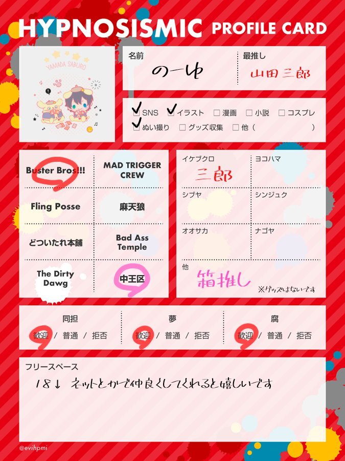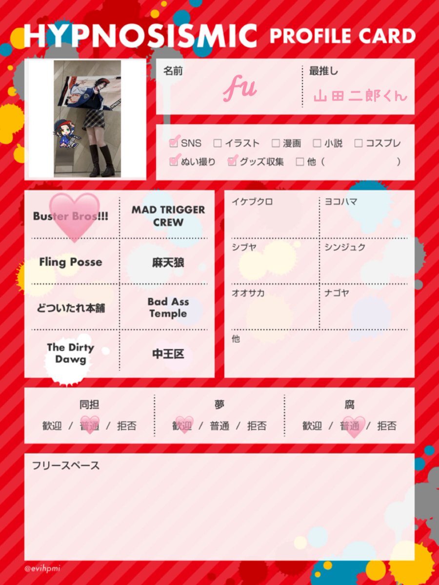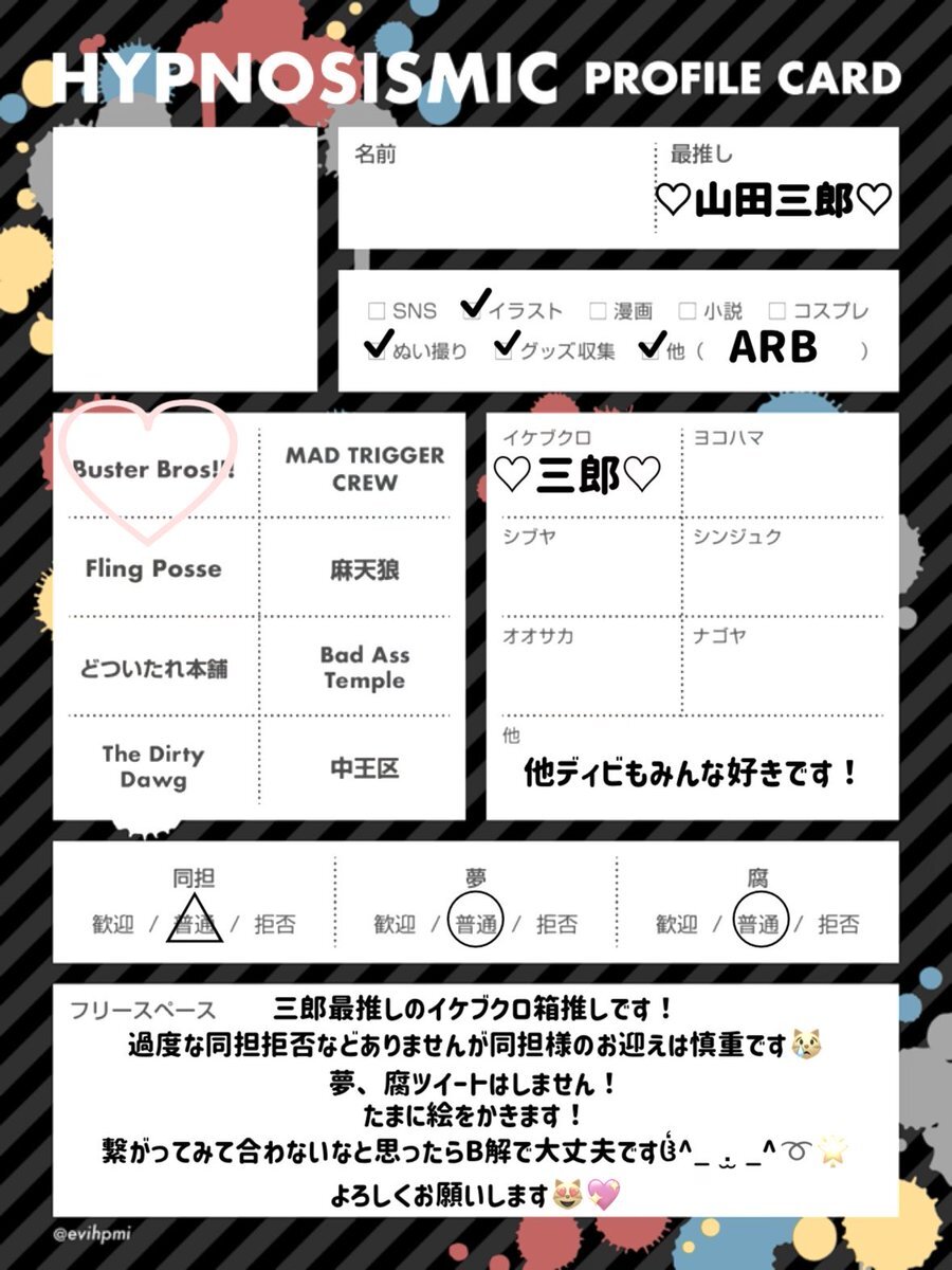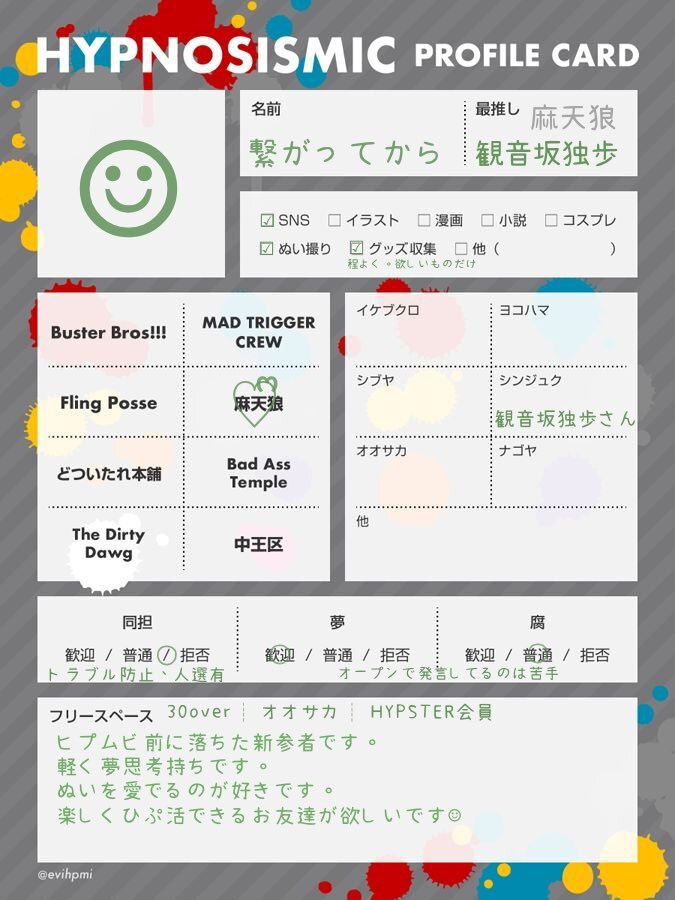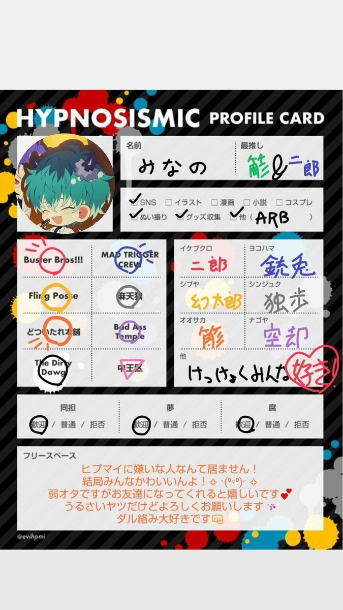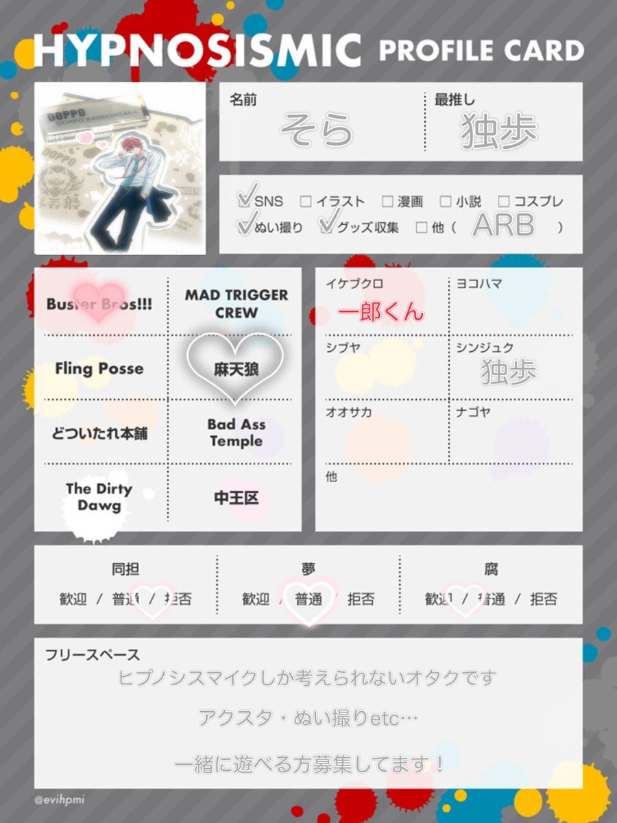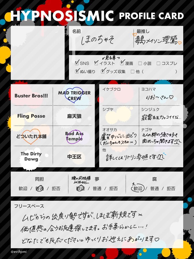 いっぱい友達欲しくて書いてみた!! あんまり活発ではないけどリアルで語れる友達いなさすぎてここにいる皆様と仲良くなりたい……!! #ヒプマイ自己紹介カード #ヒプマイ好きさんと繋がりたい #ヒプマイ好きな人と繋がりたい pic.x.com/RnGnk6pB0u