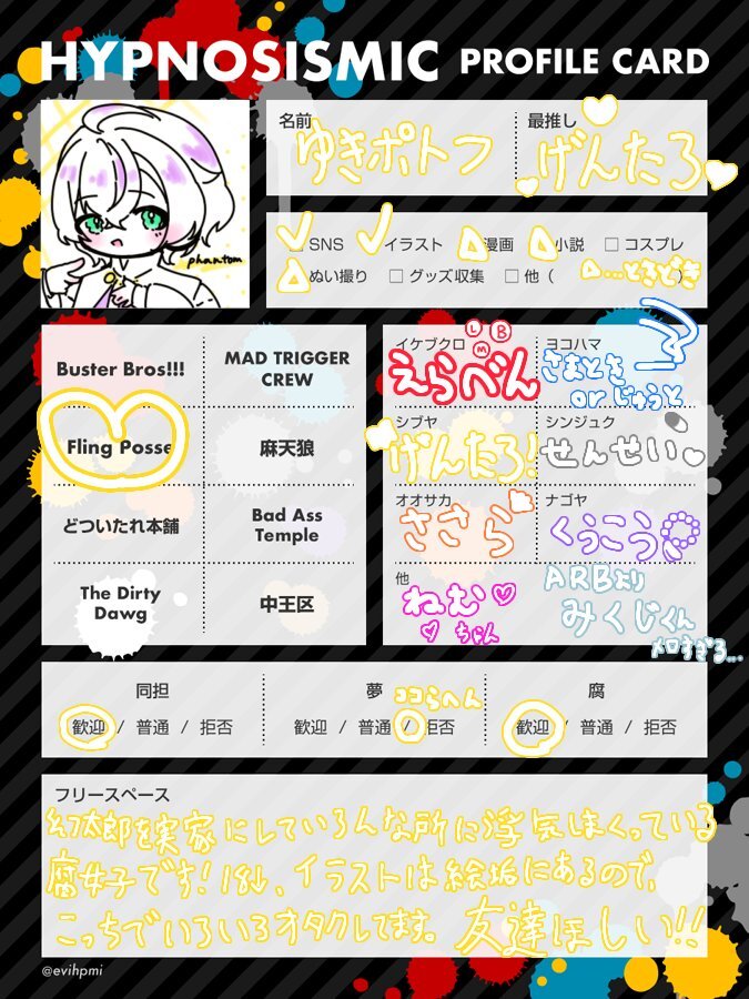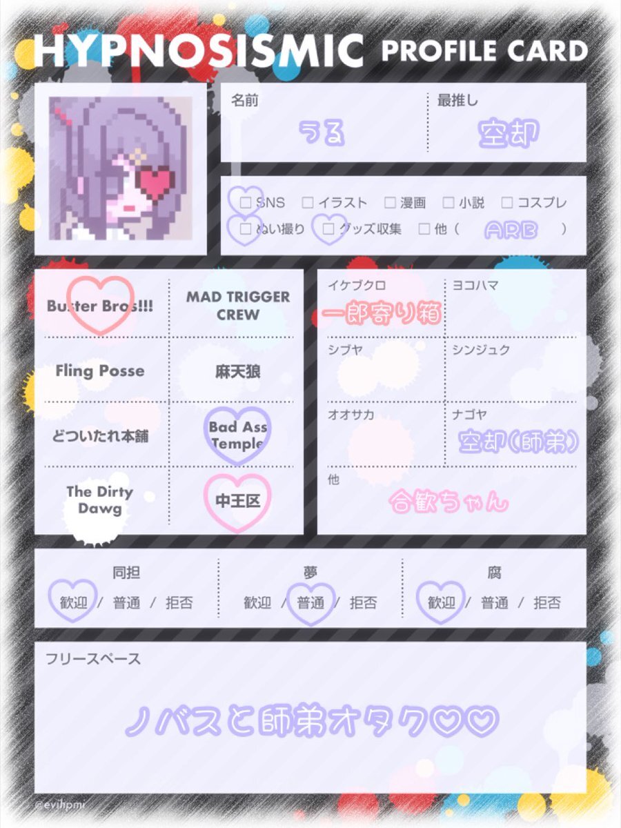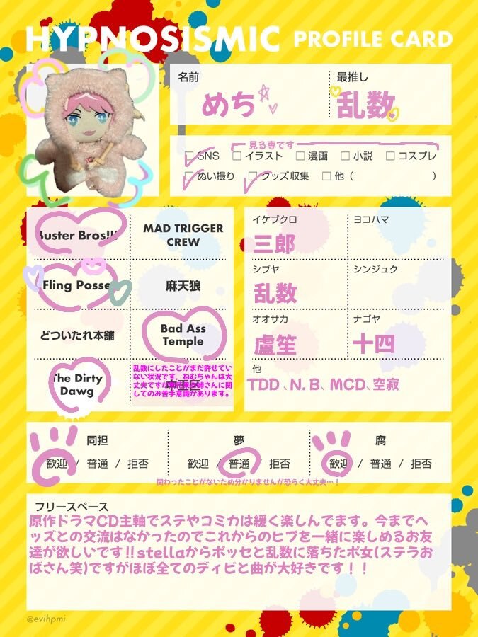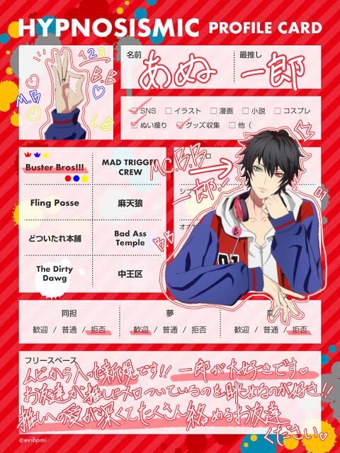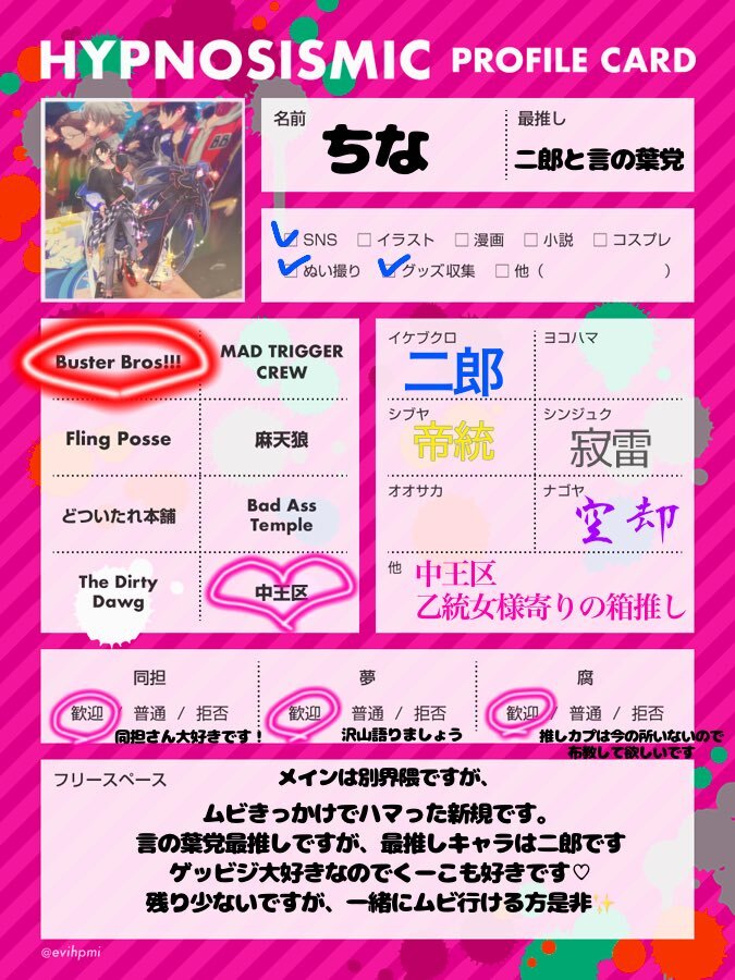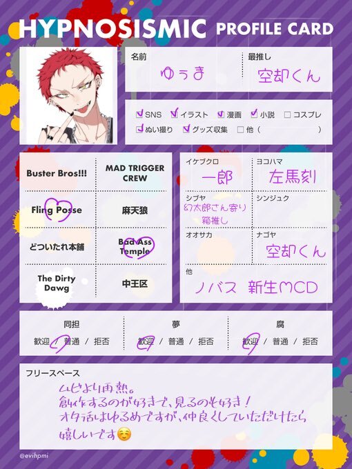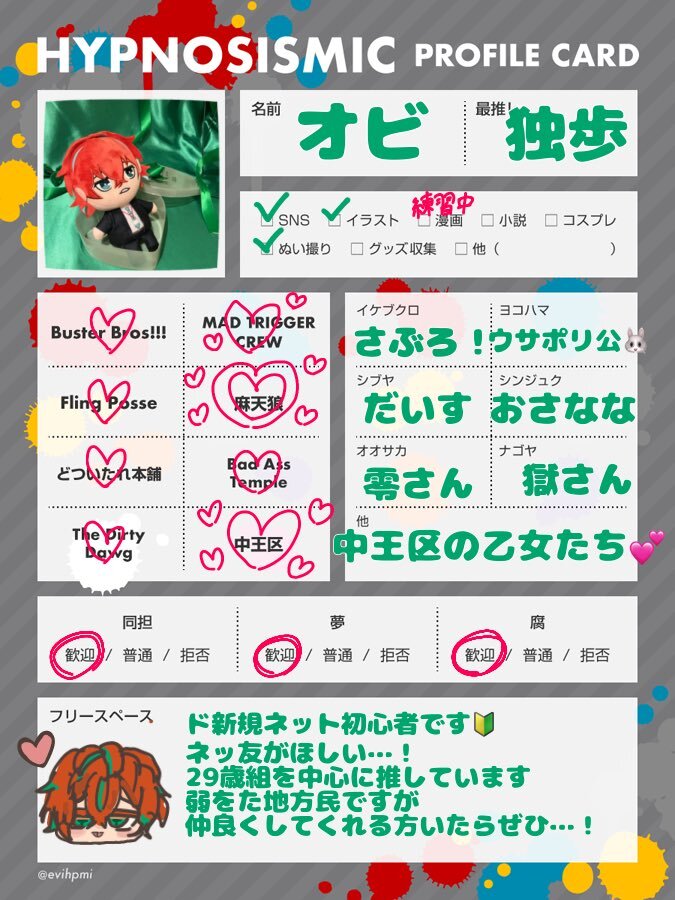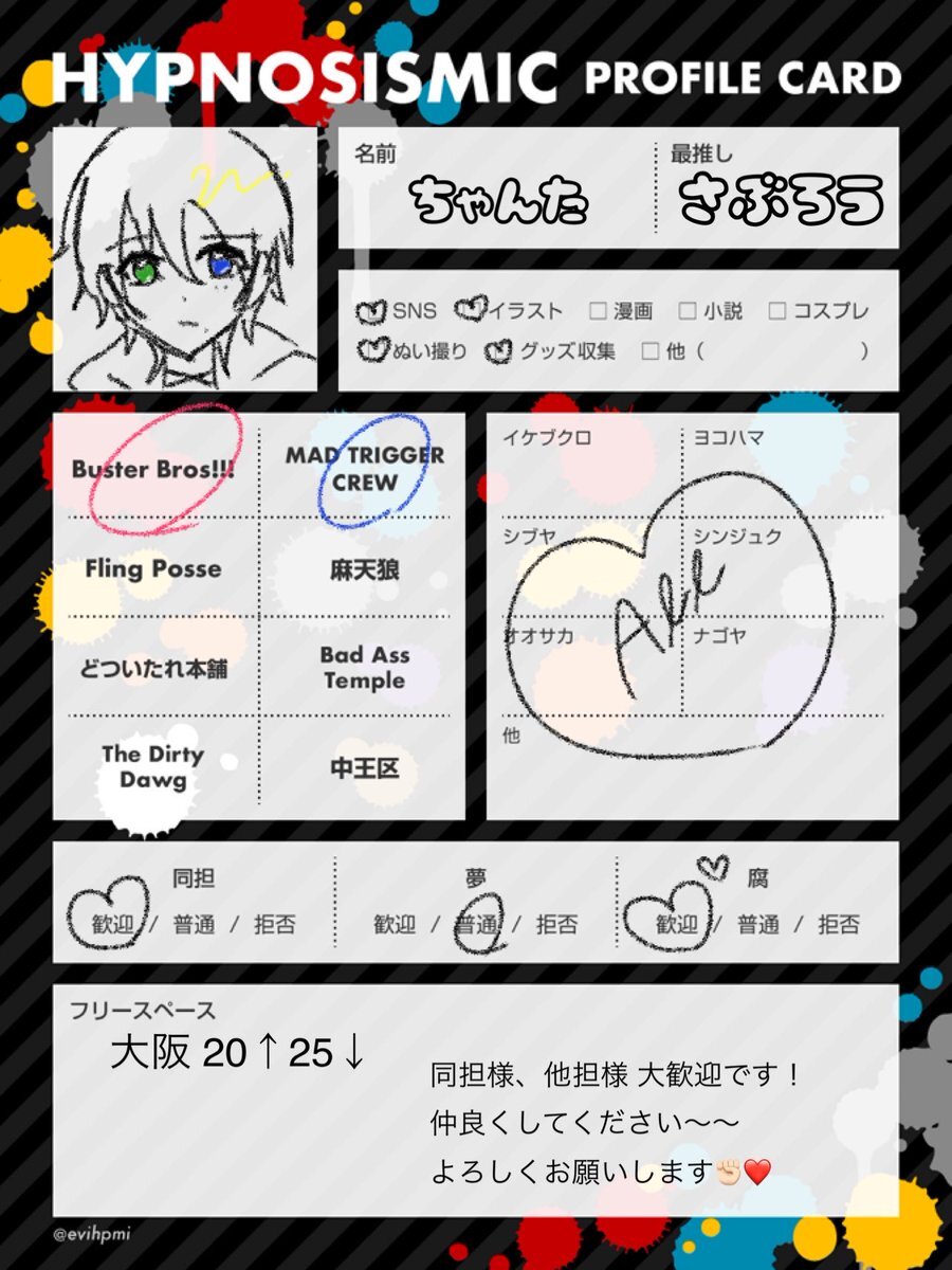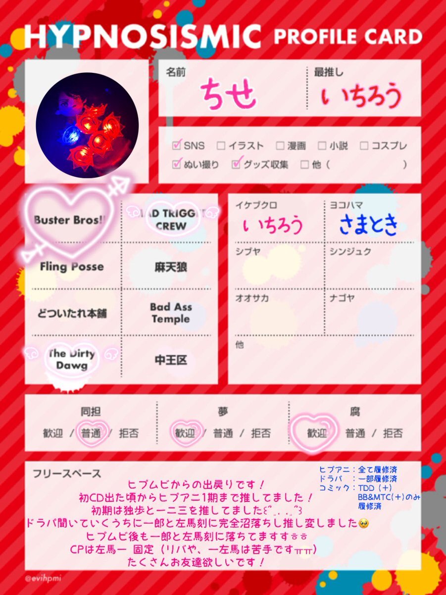 いっぱい友達欲しくて書いてみた!! あんまり活発ではないけどリアルで語れる友達いなさすぎてここにいる皆様と仲良くなりたい……!! #ヒプマイ自己紹介カード #ヒプマイ好きさんと繋がりたい #ヒプマイ好きな人と繋がりたい pic.x.com/RnGnk6pB0u