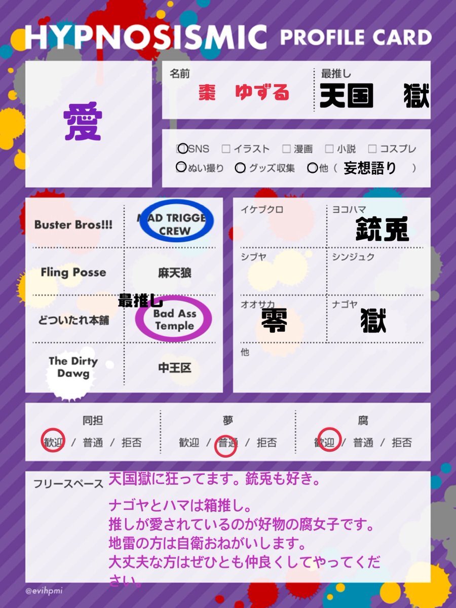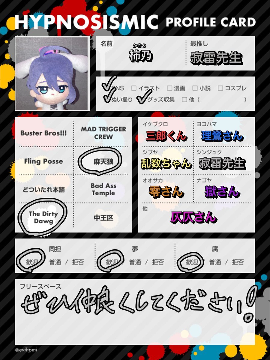 @null 誤って削除してしまった為新たに失礼します😿 ♡にて気になり様お迎え上がります❣️❣️ profcard.info/u/YZtTugSljjSe… ⬆️もしくはALT一読お願い致します🙇🏻♀️ #ヒプマイ好きさんと繋がりたい #ヒプマイ好きな人と繋がりたい #ヒプマイ自己紹介カード pic.x.com/RyiouRU21G