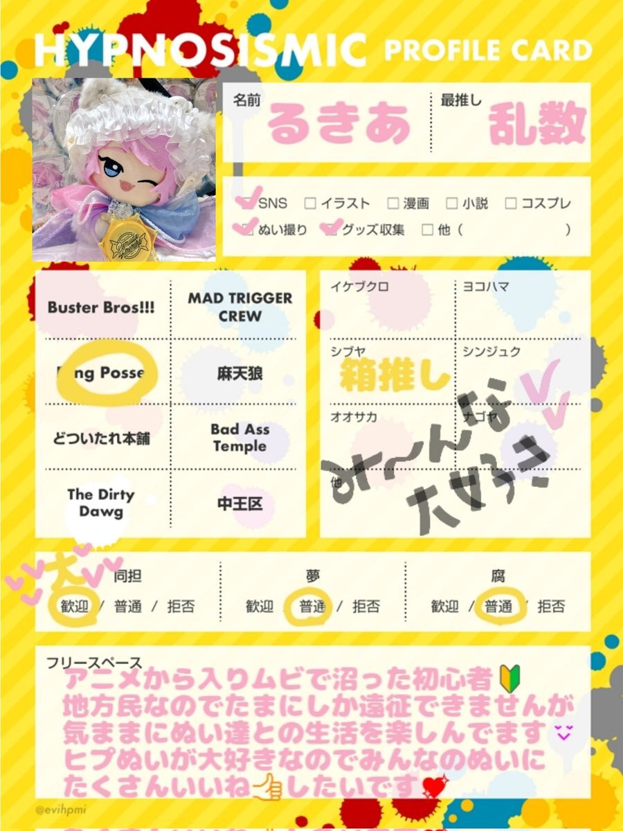 自己紹介カード作ったので🏷️お借りします!ヒプぬいが大好きな私にお友達ください🥺💖 乱数最推しのシブヤ箱推しです💛 全反応気になった方ゆっくりお迎えに行きます⊹˚₊♡⟡˙⋆ #ヒプマイ自己紹介カード #ヒプマイ好きな人と繋がりたい #ヒプマイ好きさんと繋がりたい pic.x.com/81rKHbLJfz