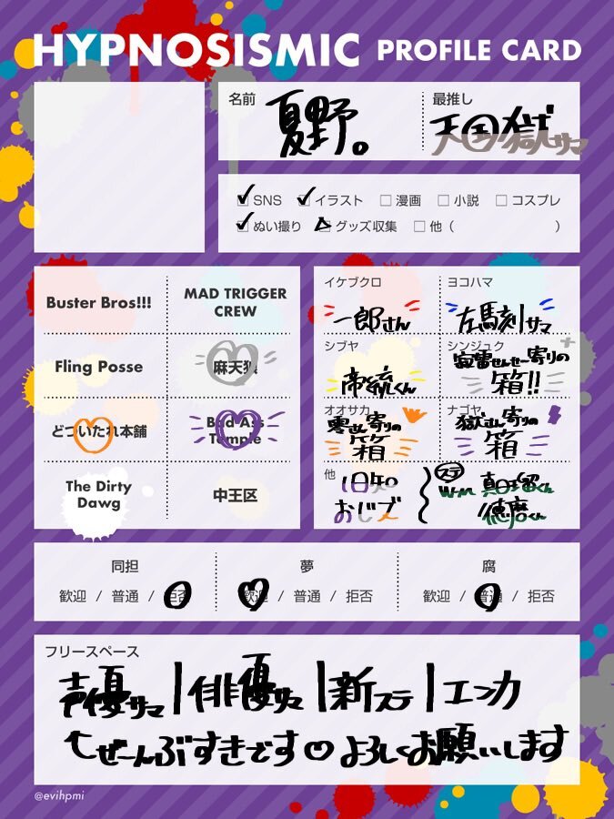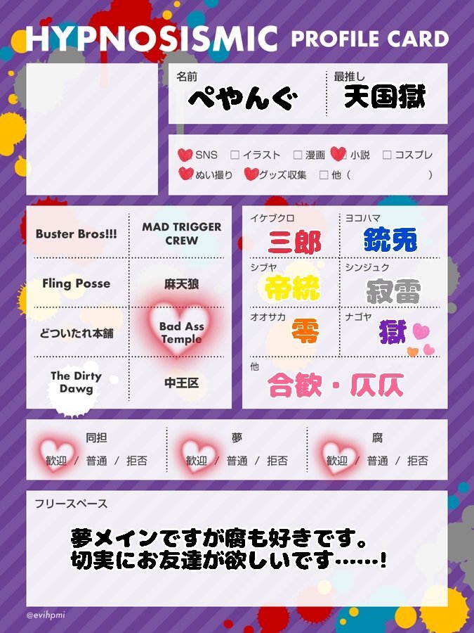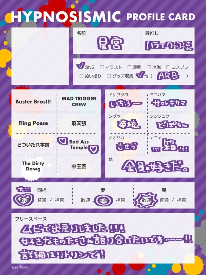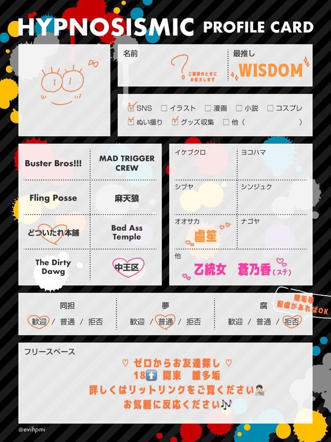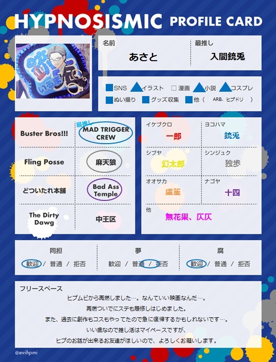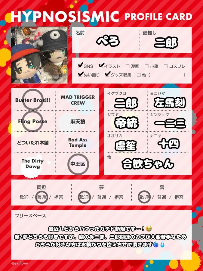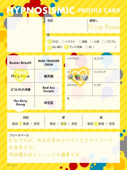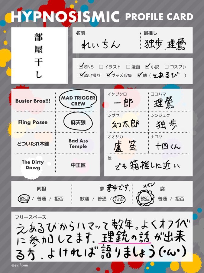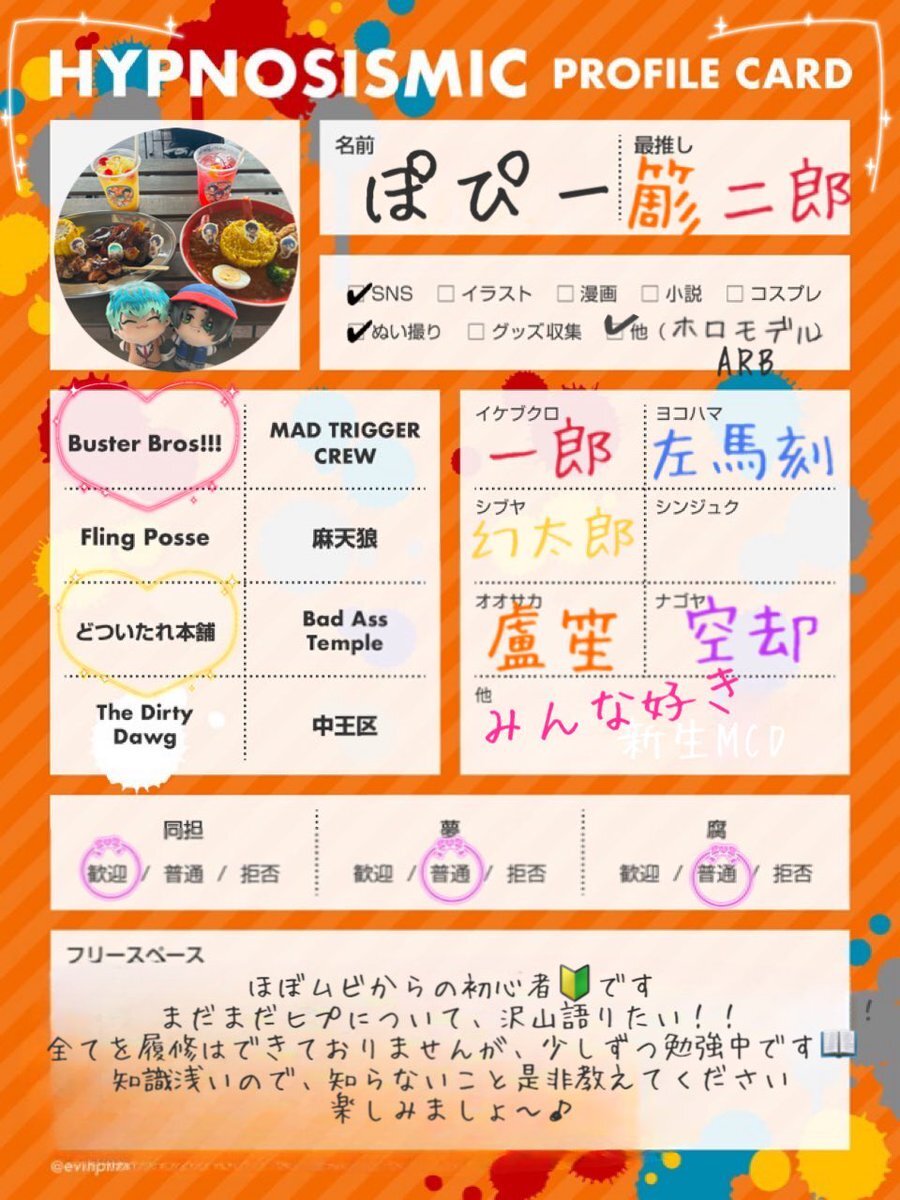 ⚠️hpmicos⚠️ 最近hpmiハマったので久々に🏷️ やります‼️ぜひ♥️と♻️を よろしくお願いします! #ヒプマイオタクと繋がりたい #ヒプマイ自己紹介カード #ヒプマイ好きさんと繋がりたい #ヒプマイ好きな人と繋がりたい pic.x.com/8p6hsOaUdw