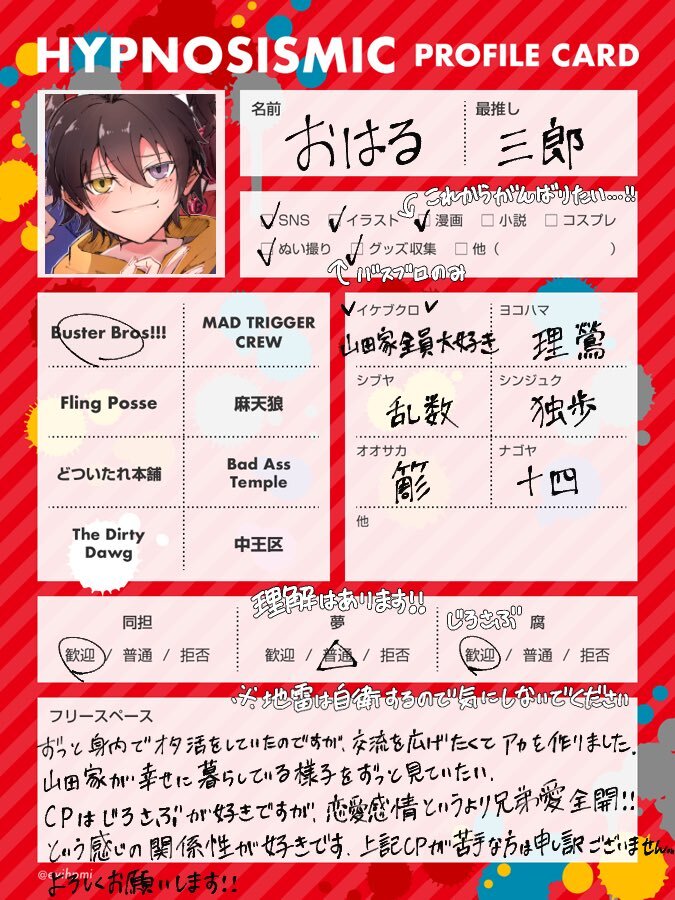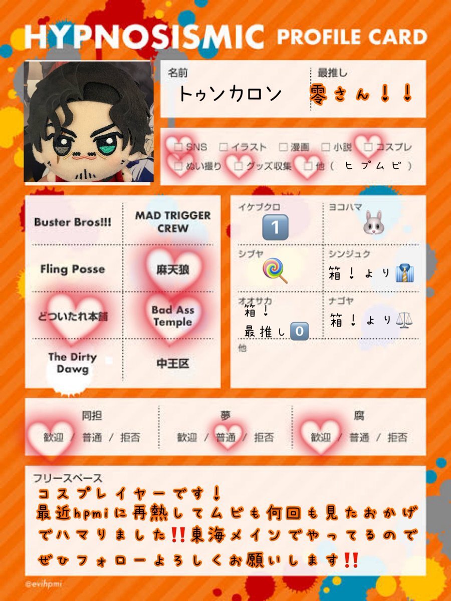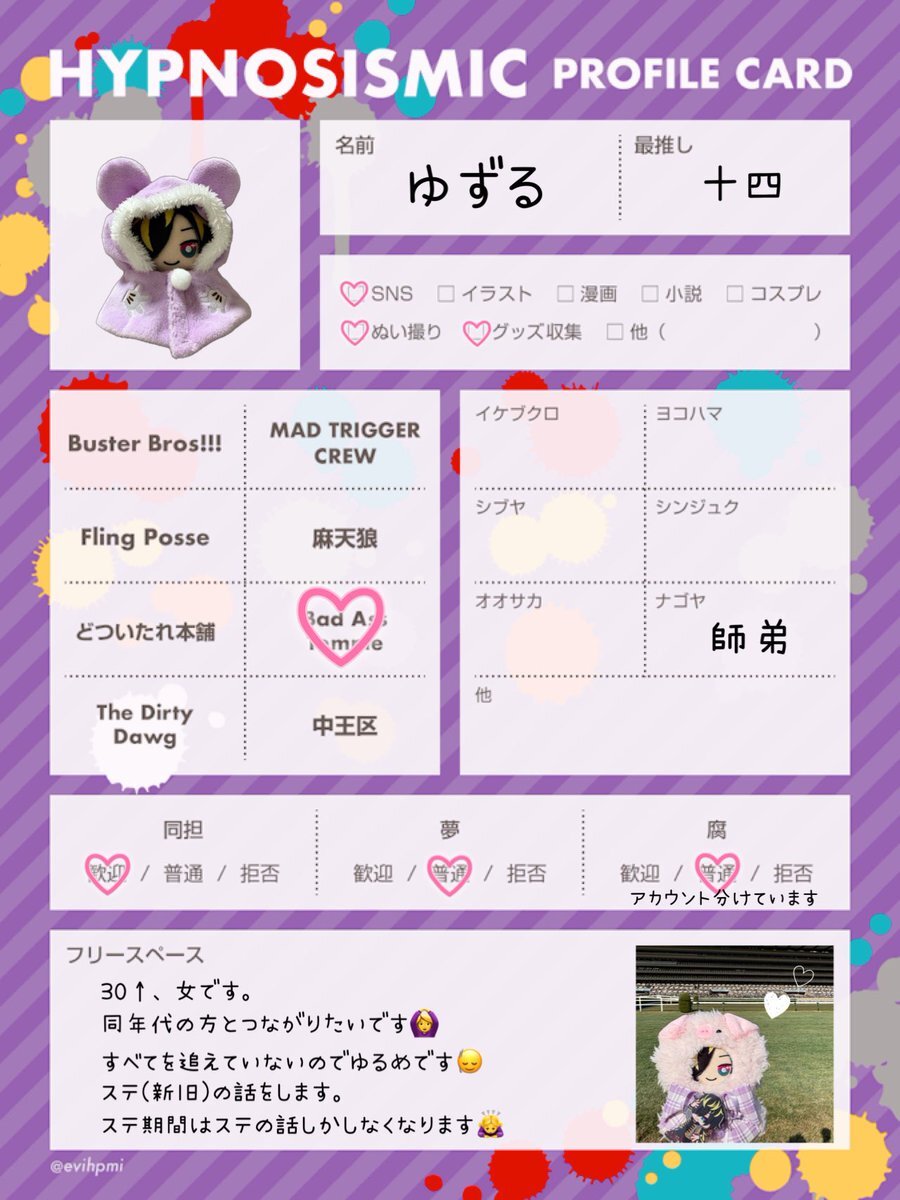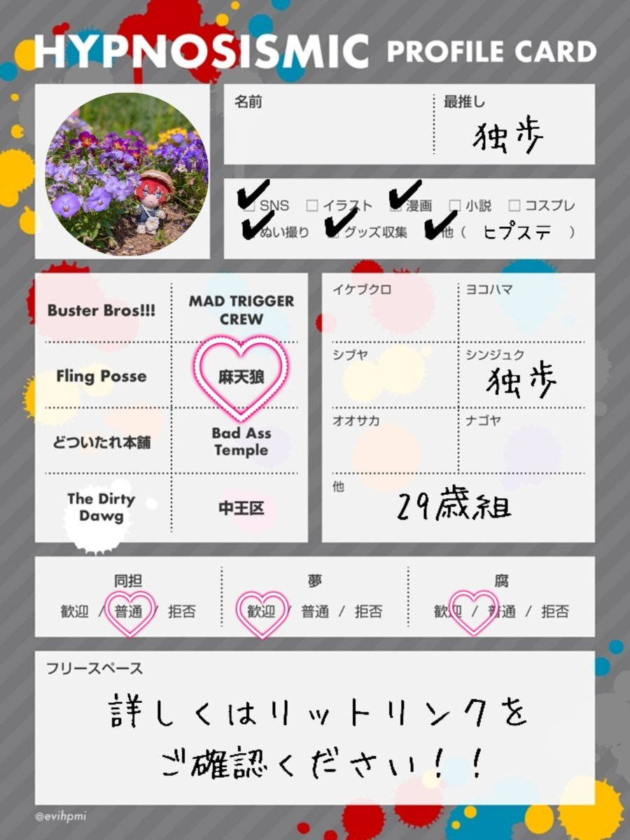@null 誤って削除してしまった為新たに失礼します😿 ♡にて気になり様お迎え上がります❣️❣️ profcard.info/u/YZtTugSljjSe… ⬆️もしくはALT一読お願い致します🙇🏻♀️ #ヒプマイ好きさんと繋がりたい #ヒプマイ好きな人と繋がりたい #ヒプマイ自己紹介カード