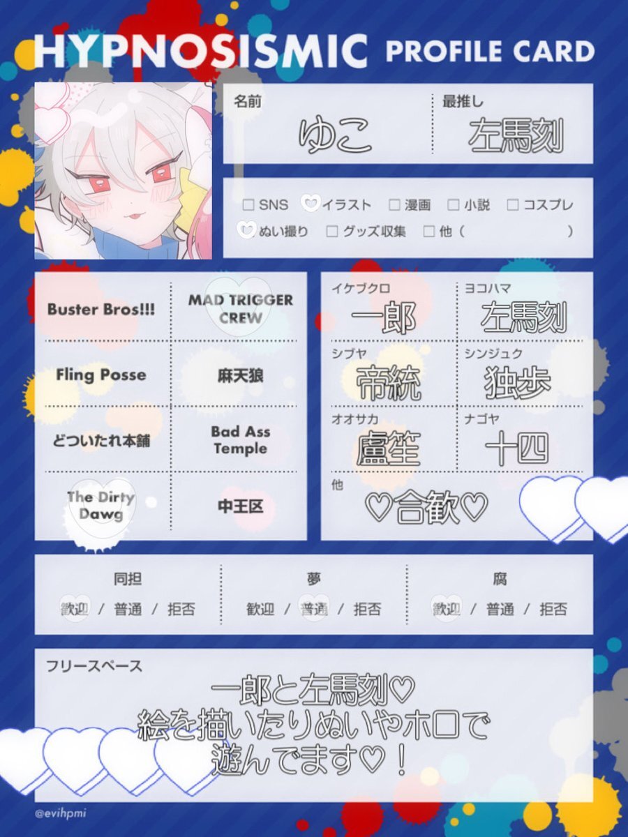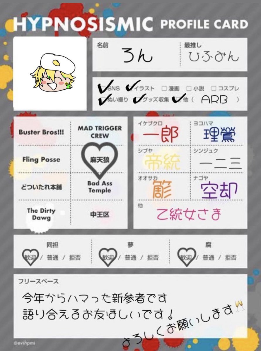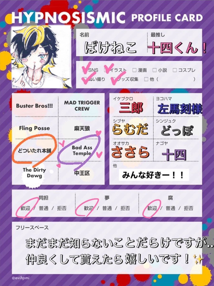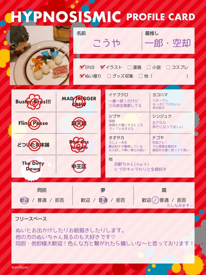 怜依と申します……!! 中王区箱推し、ポッセ、テンプル推しです……! 宜しければ仲良くして下さいっつ!! #ヒプマイ自己紹介カード #ヒプマイ絵描きさんと繋がりたい #ヒプマイ好きさんと繋がりたい pic.x.com/E7NRPcUmod