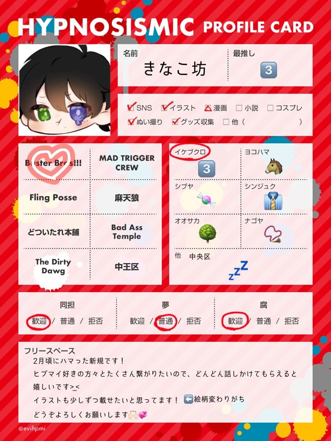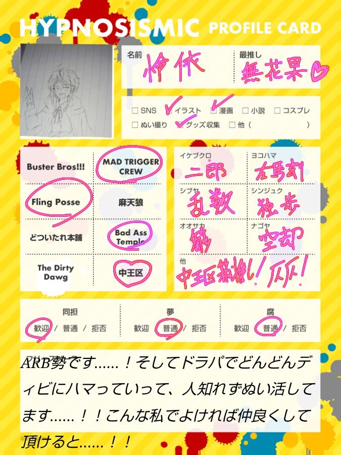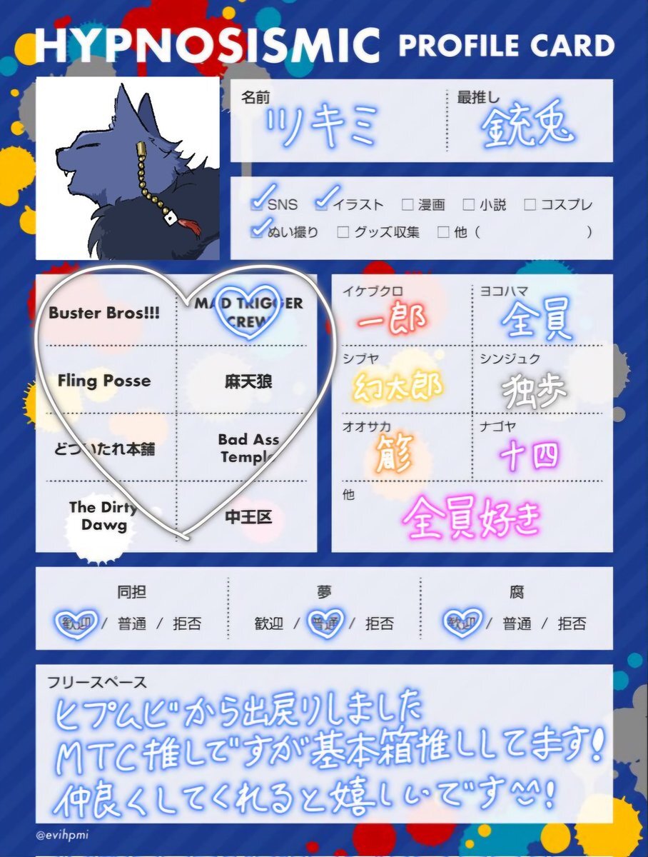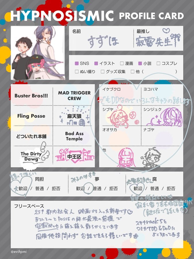 怜依と申します……!! 中王区箱推し、ポッセ、テンプル推しです……! 宜しければ仲良くして下さいっつ!! #ヒプマイ自己紹介カード #ヒプマイ絵描きさんと繋がりたい #ヒプマイ好きさんと繋がりたい pic.x.com/E7NRPcUmod