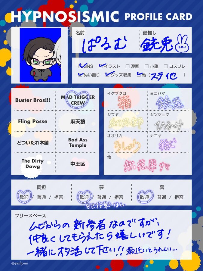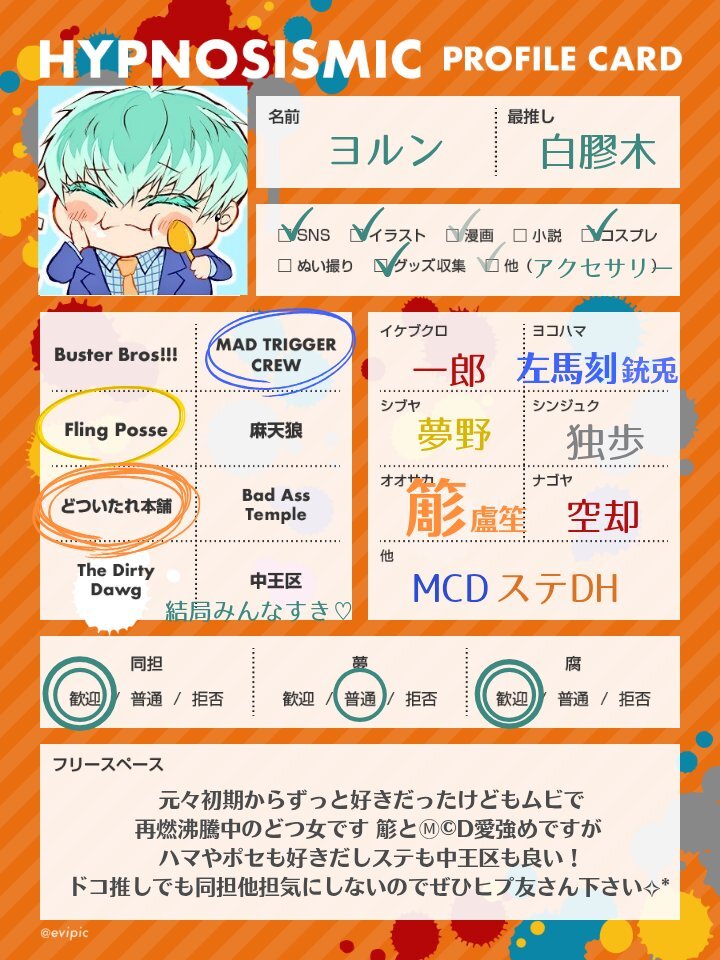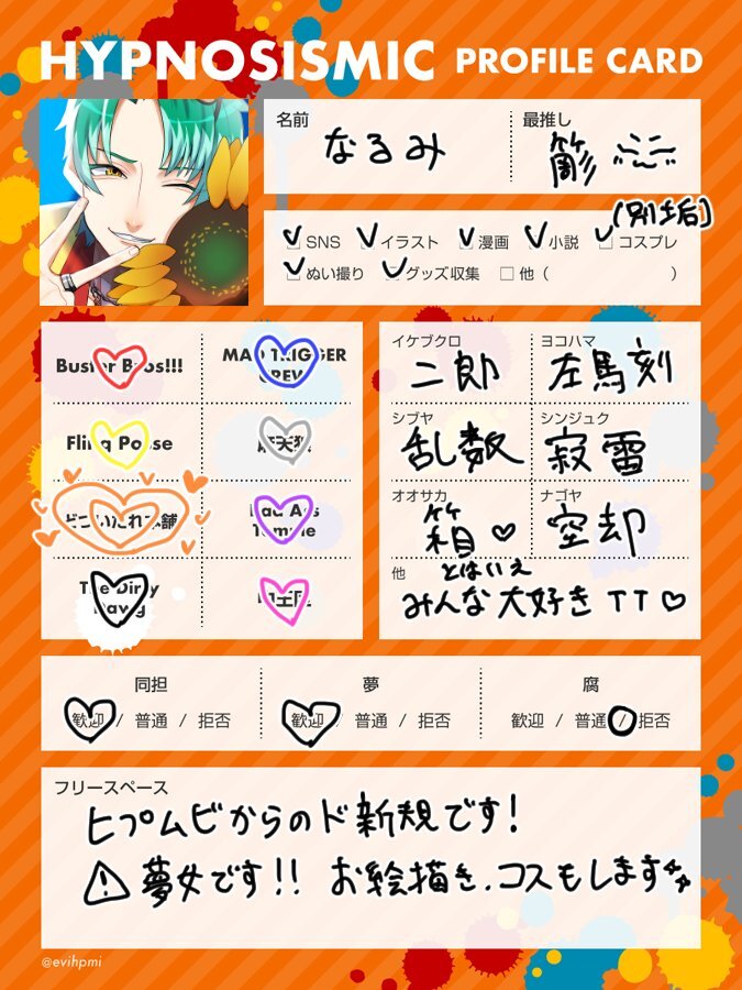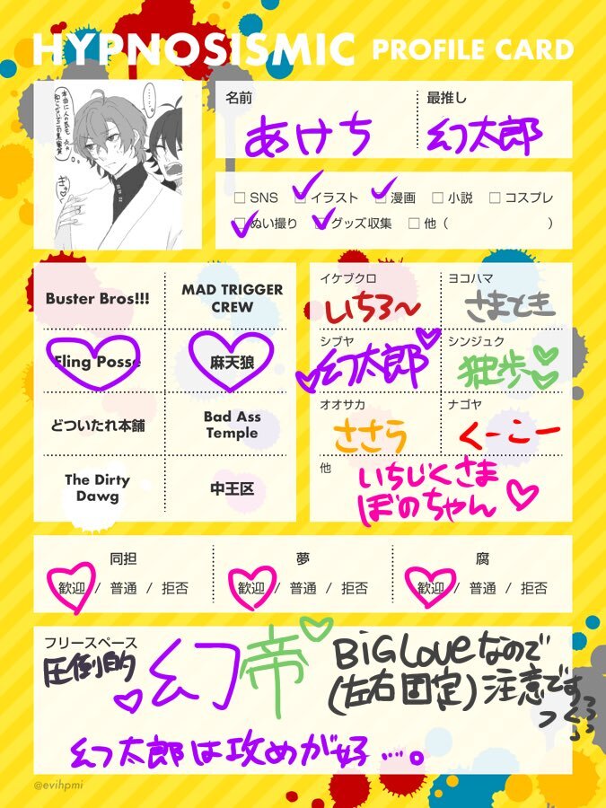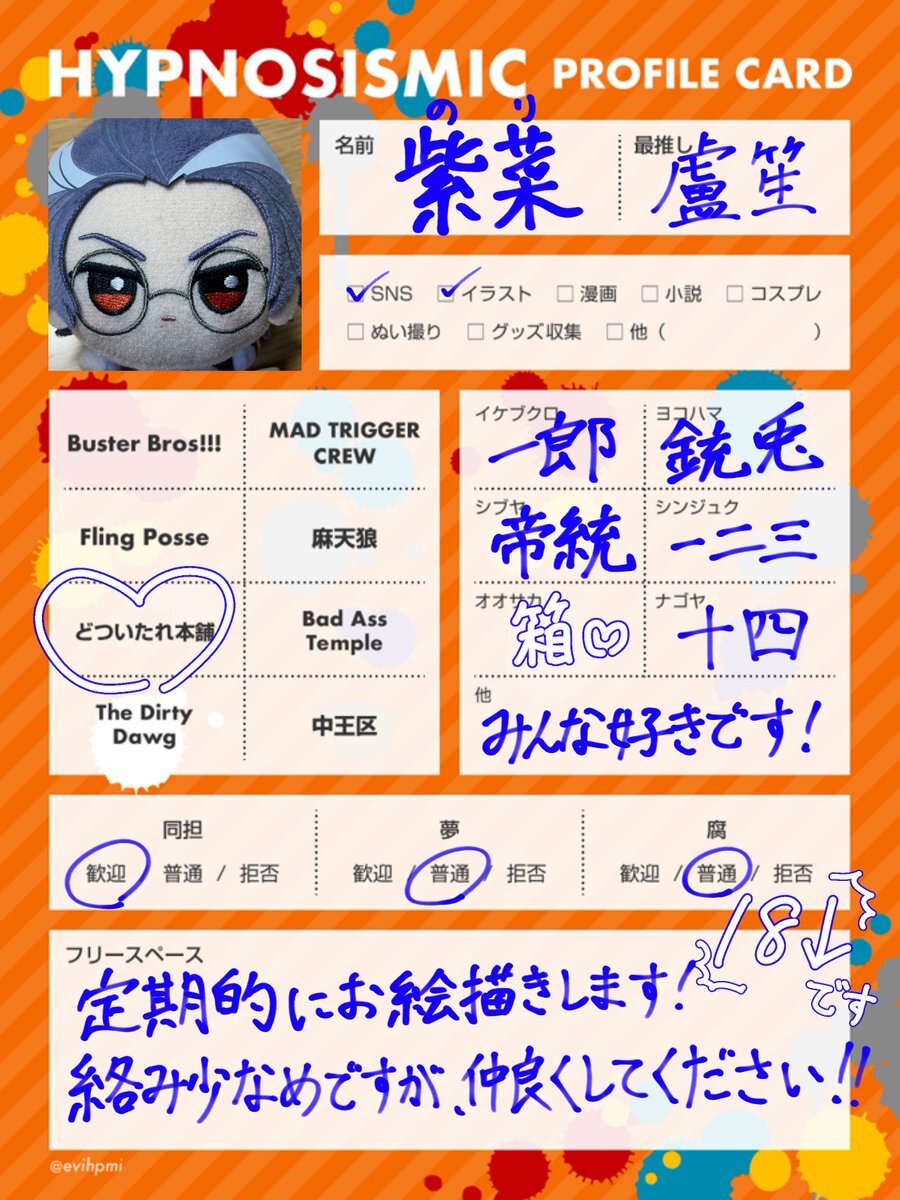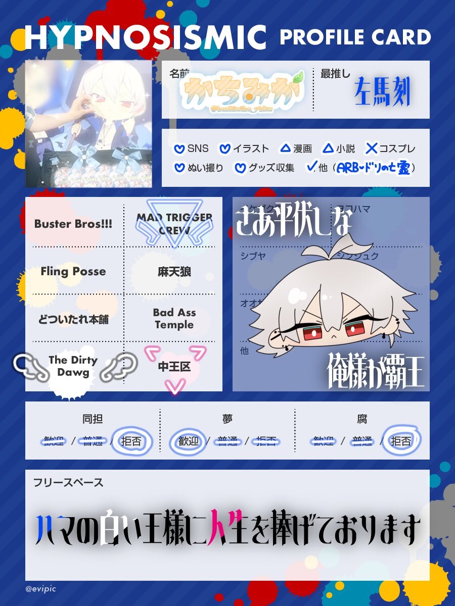 tag🏷️◯。 18⬇︎|九州|❤️🔄全反応巡回 ムビの波で沼にハマった新規です!! 絵を描いたり字を書いたりします 是非仲良くしていただけると嬉しいです😆 #ヒプマイ好きさんと繋がりたい #ヒプマイ好きな人と繋がりたい #ヒプマイ絵描きさんと繋がりたい #ヒプマイ自己紹介カード pic.x.com/8NBmMoO8gj