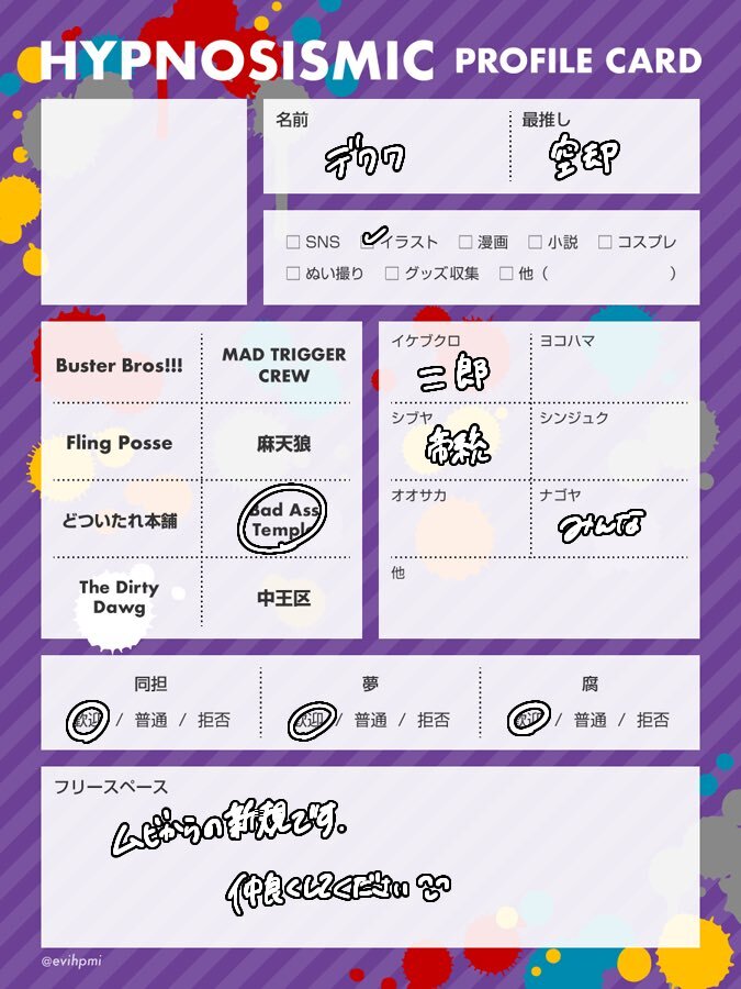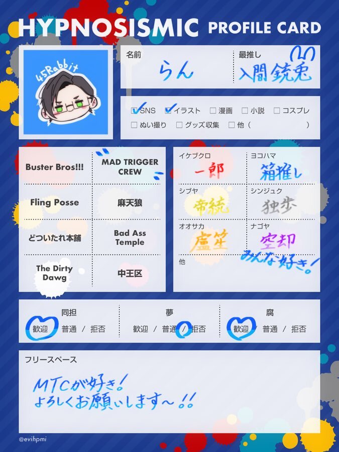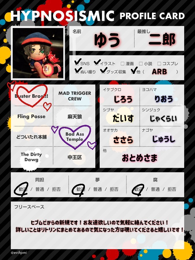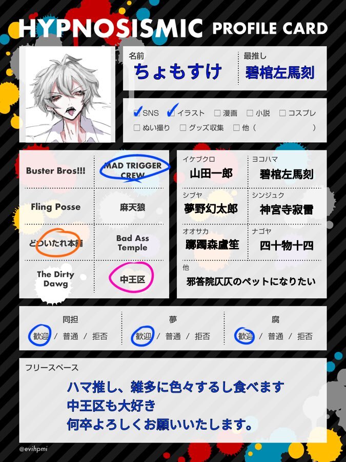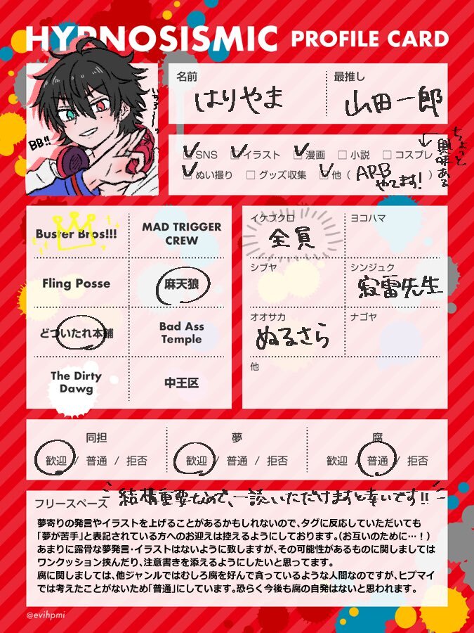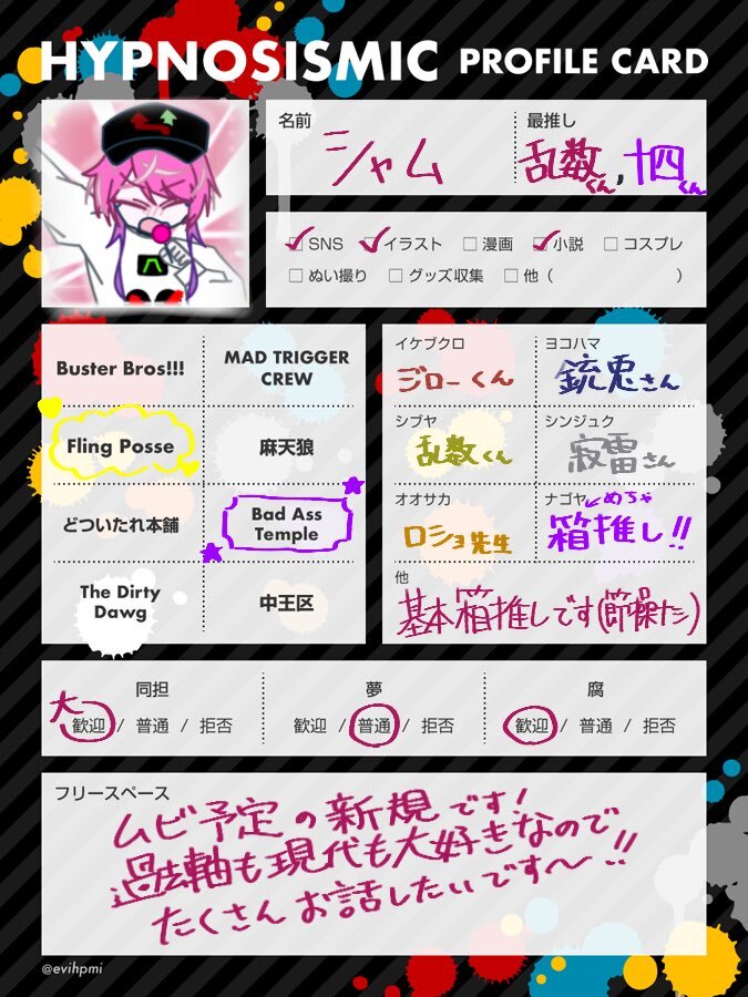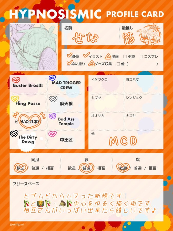 tag🏷️◯。 18⬇︎|九州|❤️🔄全反応巡回 ムビの波で沼にハマった新規です!! 絵を描いたり字を書いたりします 是非仲良くしていただけると嬉しいです😆 #ヒプマイ好きさんと繋がりたい #ヒプマイ好きな人と繋がりたい #ヒプマイ絵描きさんと繋がりたい #ヒプマイ自己紹介カード pic.x.com/8NBmMoO8gj