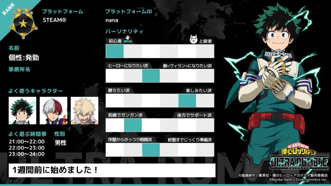 1週間前から始めた初心者です! デュオトリオで遊びたいので遊んでくれる方募集です! #ヒロアカ好きな人と繋がりたい #ヒロアカURで繋がりたい #ヒロアカUR自己紹介カード pic.x.com/S4cdcaqo6e