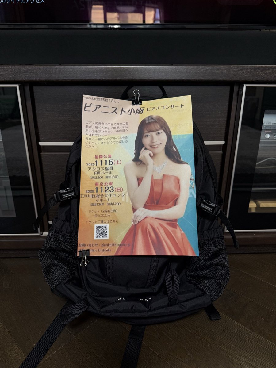 小雨さんのコスプレ見たいし、皆さんチケット買って下さい‼️ 小雨さんのキーホルダー掛けてるバックパックにポスター貼って通勤🤩・・・と考えたんですが、車🚘通勤でした👎 代わりに皆さん拡散お願いします‼️ ➡️ kosame_pf #ピアニスト小雨 #ピアノコンサート pic.x.com/def46zeNEx x.com/kosame_piano/s…