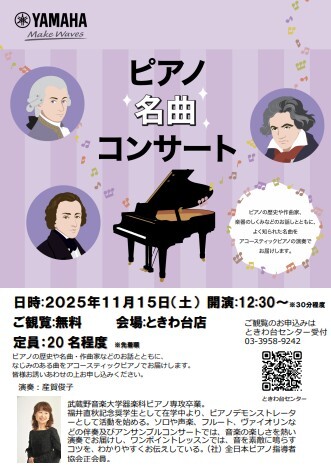 11月15日(土)12:30~ ときわ台センター1Fロビー ヤマハデモンストレーター:産賀 俊子さんによる【ピアノ名曲コンサート】を開催いたします♬ (30分程度を予定しております) 人数に限りがございますので、ご興味のある方はご予約お待ちしております。 ※20名程度先着 #ピアノコンサート pic.x.com/DztnzXSXaz