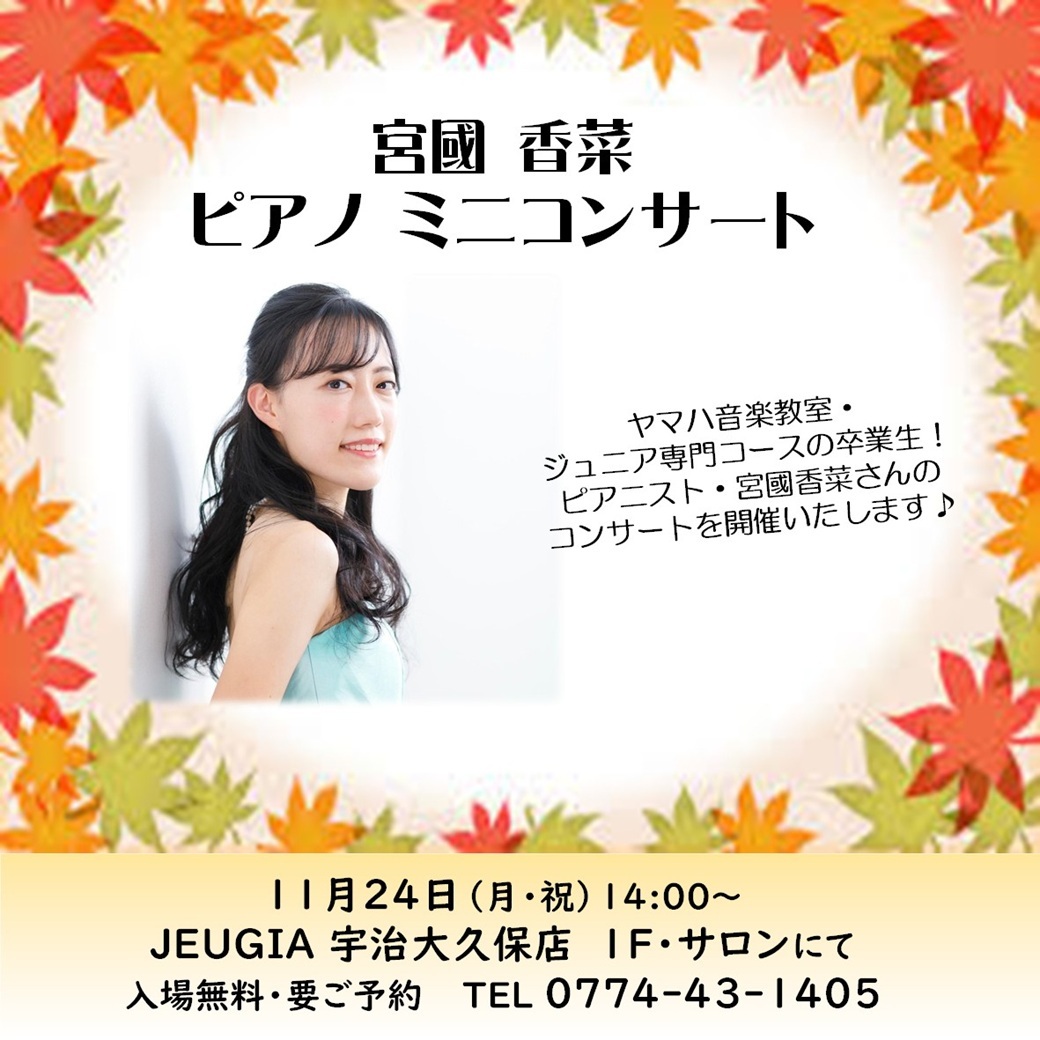 11月24日(月・祝)14:00~ JEUGIA 宇治大久保店1Fサロンにて宮國 香菜さんのピアノミニコンサート🎹を開催いたします💖 入場無料(要ご予約・TEL 0774-43-1405) jeugia.co.jp/hall_26/news-d… #ピアノコンサート #宮國香菜 #ヤマハピアノ #京都ピアノ #宇治ピアノ #JEUGIA #ヤマハ音楽教室 pic.x.com/nS1jkyeItV