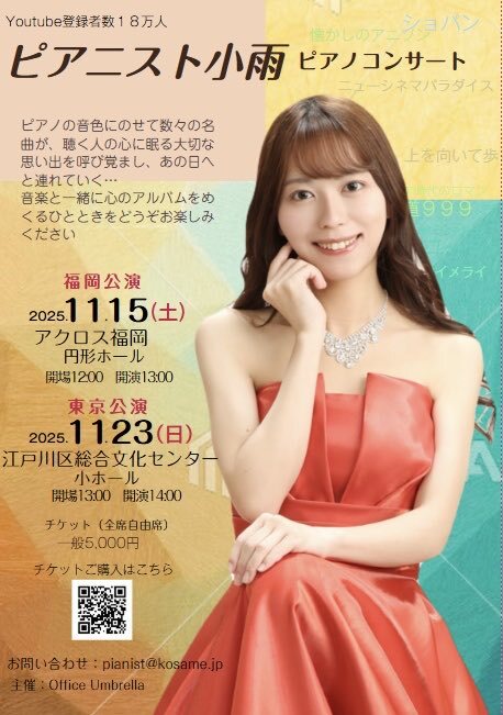 2025.10.26 素敵なピアニスト小雨さんのピアノコンサートが11月15日福岡アクロス福岡で、11月23日東京江戸川区総合文化センターで開催されます‼️ 素敵な演奏を多くの人に聴いてもらう為、特に福岡、東京の友達に拡散お願いします🙇 #ピアニスト小雨 #ピアノコンサート instagram.com/p/DQRu81UCUcK/…