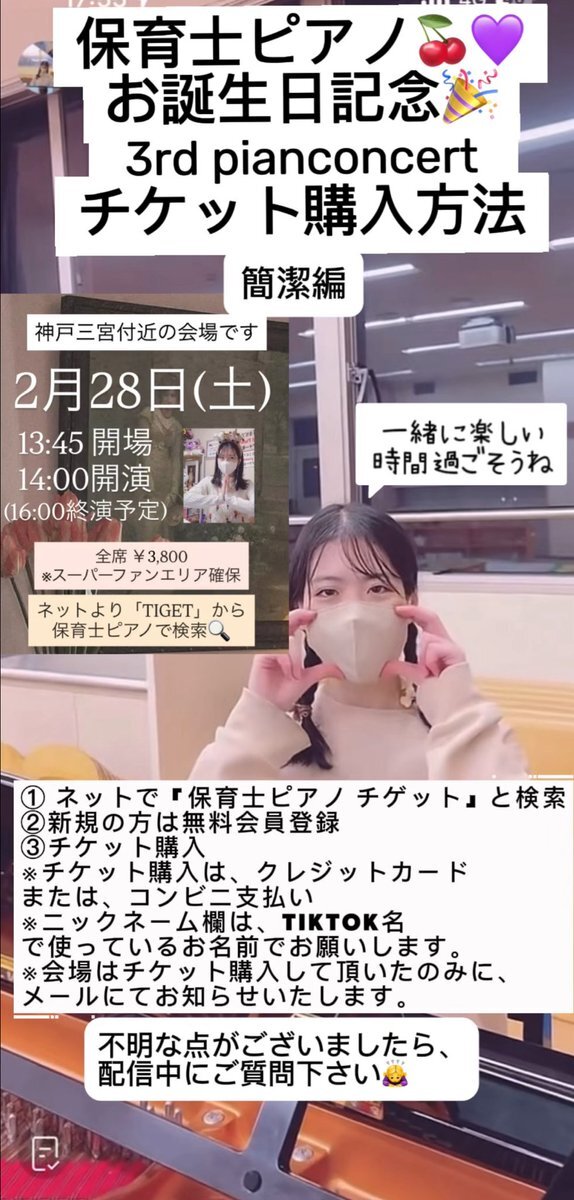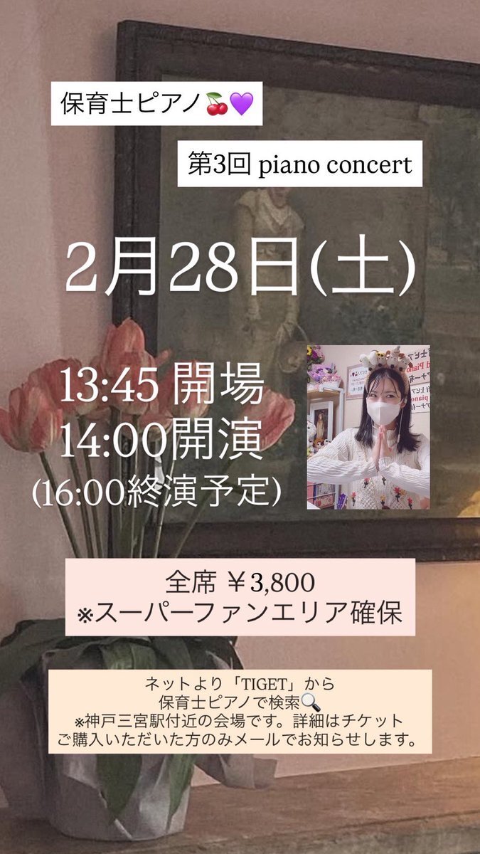 保育士ピアノ🍒💜 3回目のピアノコンサートを神戸にて開催!! チケットの詳細 購入は、ネットで「保育士ピアノ チゲット」と検索 2月13日にお誕生日を迎える保育士ピアノを一緒にお祝いできたら嬉しいです✨ コンサートでお会いしましょう🎵 #グランドピアノ #ピアノコンサート #神戸 @yo__yugutoo pic.x.com/LAIaijTHwG