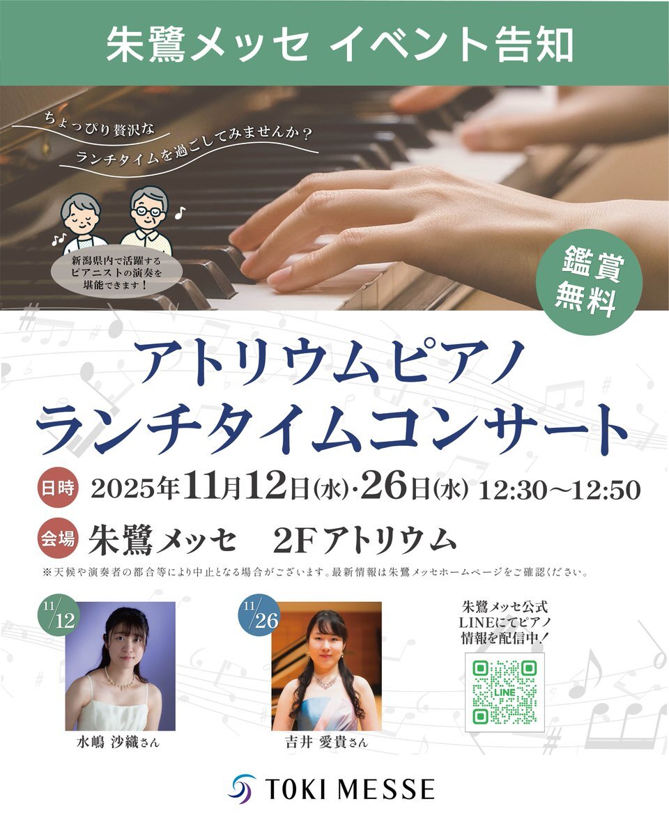 🎵10月アトリウムピアノ ランチタイムコンサート🎹ご鑑賞ありがとうございました!来月もぜひお越しください。 🔗詳細はこちら→ tokimesse.com/sp/topics/deta… #TOKIMESSE #朱鷺メッセ #トキメッセ #朱鷺メッセ新潟コンベンションセンター #万代島 #新潟県 #新潟 #ピアノ #ピアノコンサート #イベント pic.x.com/xCCGj4MD21