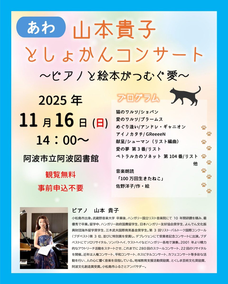 🔵阿波図書館イベント情報🔵 【山本貴子としょかんコンサート~ピアノと絵本がつむぐ愛~】 日時:11月16日(日)14時~ 場所:阿波図書館館内ピアノ前 観覧無料、申込不要 (=・Ⓦ・=)「愛がテーマの素敵なピアノコンサート✨大切な人とぜひ来てにゃ💖」 #阿波図書館 #図書館イベント #ピアノコンサート pic.x.com/3yQ5L4xEOg