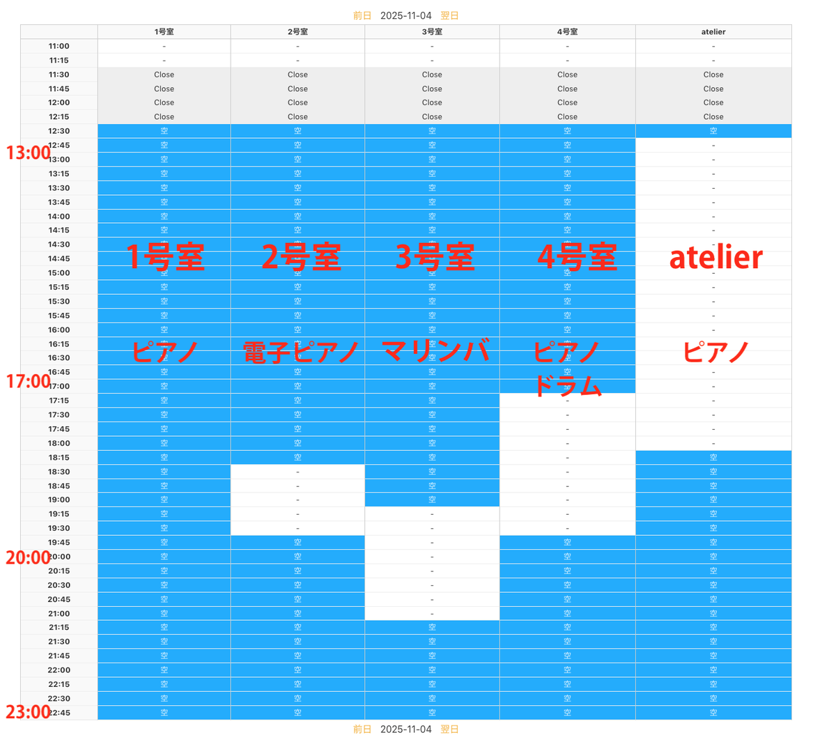 11/13 本日もよろしくお願いします。 ENOTNスタジオ空き状況→ enotn.org/calendar/ *青い部分があいている時間帯です* 【当日ご予約やお問い合わせ】TEL:092-707-2633 ENOTN詳細:enotn.org #福岡音楽スタジオ #ピアノ練習室 pic.x.com/62IIQApHWb