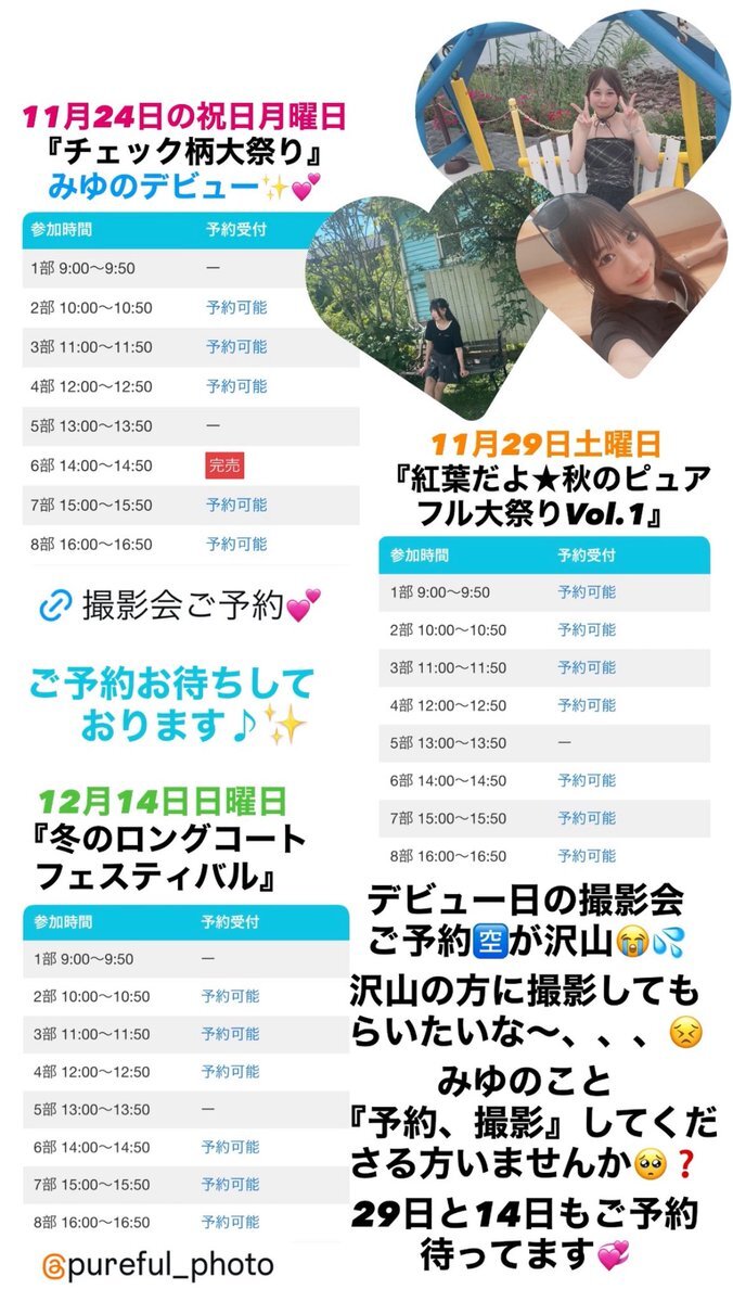 11月12月のピュアフル撮影会予定日です✨️ ご予約🈳が沢山です😔💦 みゆの事『予約、撮影』してくれませんか🥺❓ みゆは人と話すことが得意なので明るい空間で最高の1枚を一緒に創りませんか?😉 大切な時間とお金を無駄にはしません‼️ ご予約お待ちしております🙂↕️💞 #ピュアフル撮影会モデル pic.x.com/C3raZalZZC