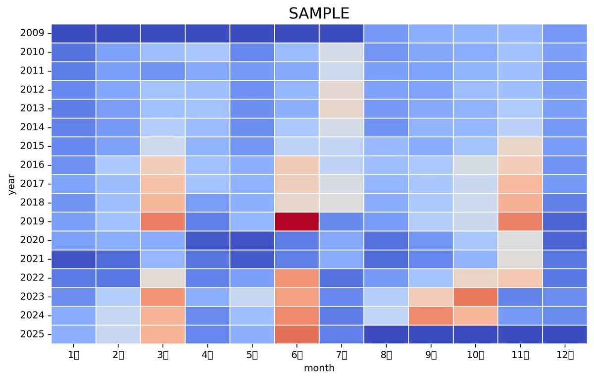 【ピンポンのPython日記 #23】 ヒートマップを月単位に整形してみました。 日ごとの動きよりも、全体の傾向がくっきり見えてきて面白い。 自分で書いたコードがこうやって形になる瞬間は、本当に嬉しいですね。分かるが広がる喜び。 #ピンポンのPython日記 #Python学習 #営業課長のPython挑戦 #可視化 pic.x.com/WL93FFBZuT