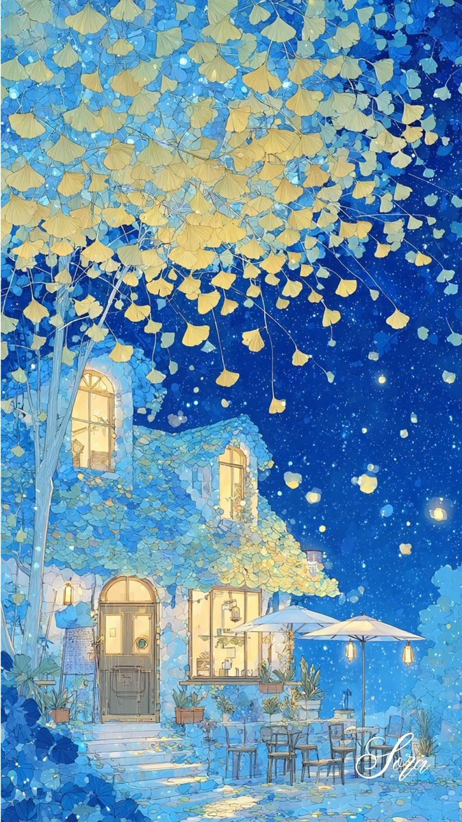 イチョウの降る夜カフェ☕️🎶 Ginkgo Leaves Falling Night Cafe 藍く染まる夜空と 黄金の銀杏🌟 #AIart #AIイラスト︎ #aiアート #ai画像 #AIイラスト好きと繋がりなたい #デジタルアート #ファンタジーアート pic.x.com/NQhx4rRrWR