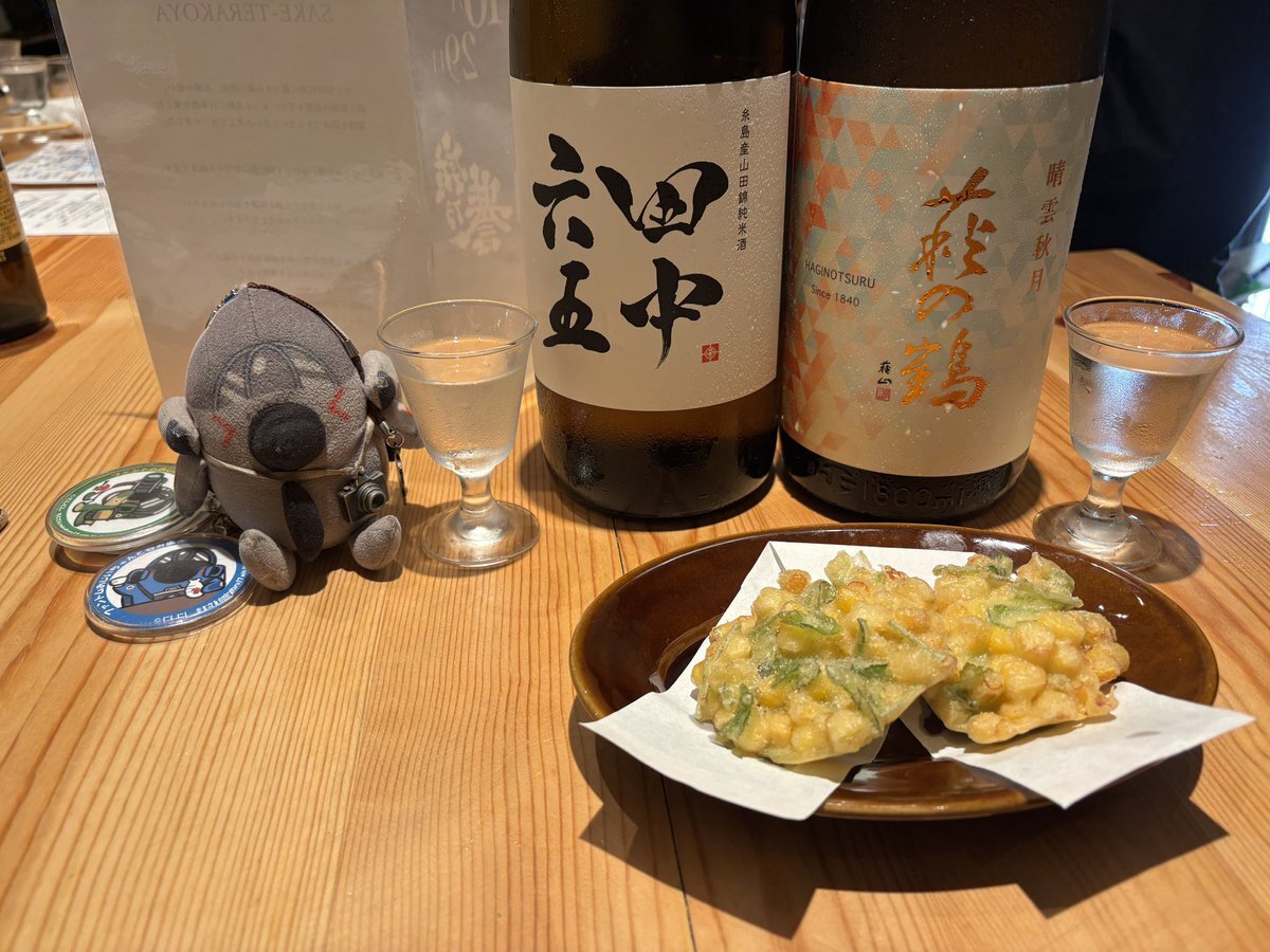 夜行バスでの機動展開前に 日本酒バル花門さん ・福岡白糸酒造さんの  田中六五 糸島産山田錦純米酒 ・宮城萩野酒造さんの  萩の鶴晴雲秋月 アテはとうもろこしのかき揚げ うまうまじゃ(笑) #ファントムおじいちゃんと吞み歩き #日本酒バル花門 #有限会社白糸酒造 #萩野酒造株式会社 pic.x.com/SbfbjF1BfR