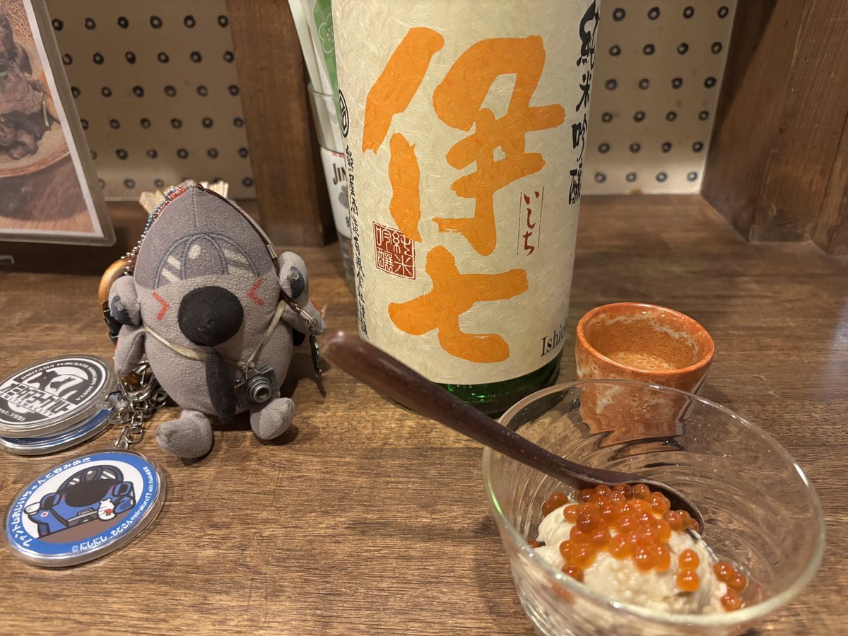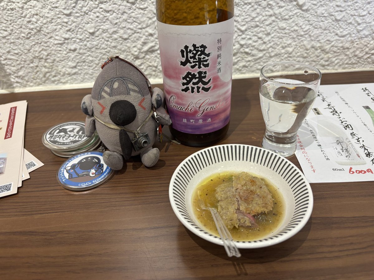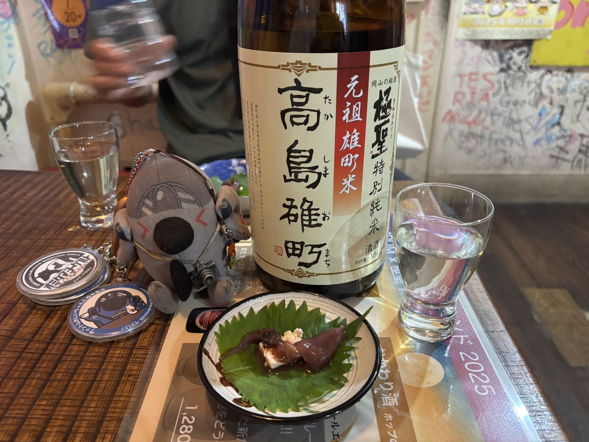 補足 お酒は 極聖特別純米元祖雄町米高島雄町 お通しは ホタルイカの沖漬けクリームチーズと大葉添え #ファントムおじいちゃんと吞み歩き #日本酒ゴーアラウンド岡山 #pompom #宮下酒造