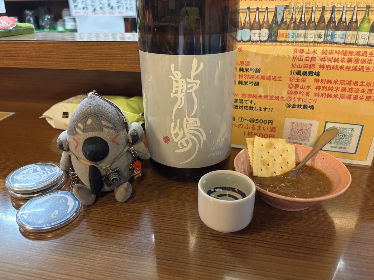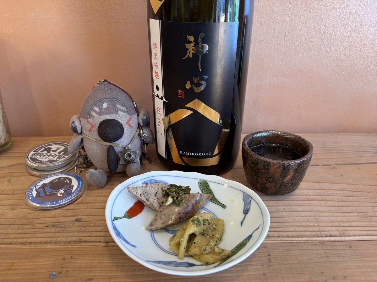 補足(^^;) お酒は 神心純米吟醸瓶囲い お通しは アルゼンチンエントラーダス #ファントムおじいちゃんと吞み歩き #日本酒ゴーアラウンド岡山 #RonRoni #嘉美心酒造