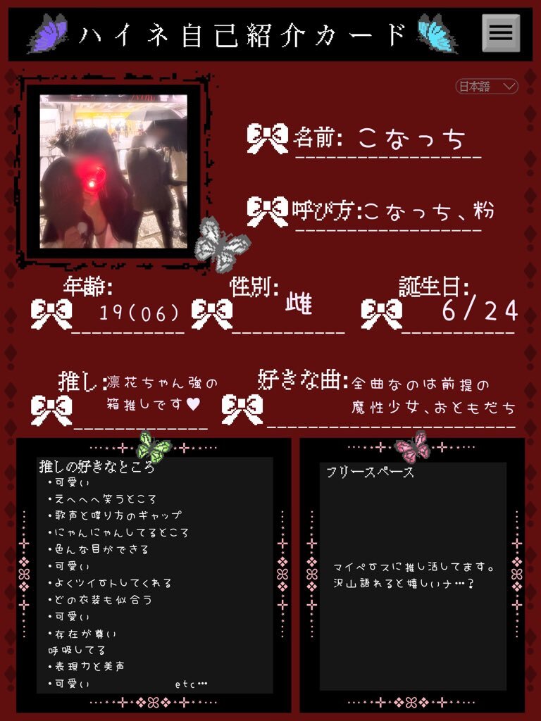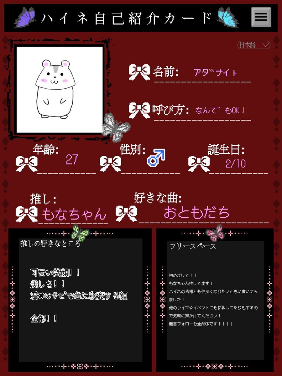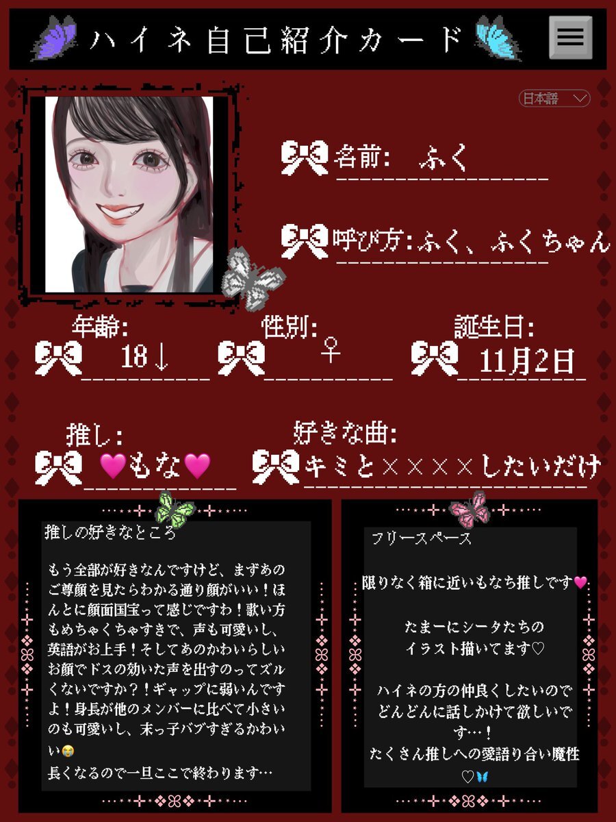 _人人人人人人人人人_ >ハイネのお友達募集<  ̄Y^Y^Y^Y^Y^Y^Y ̄ デビュー時から推してたけど専垢つくるタイミングを逃し… マウピフェスの余韻の勢いで作っちゃいました! 語れる「おともだち」欲しいです🤩💜 #ファントムシータ #ハイネ #ハイネ自己紹介カード #ハイネと繋がりたい