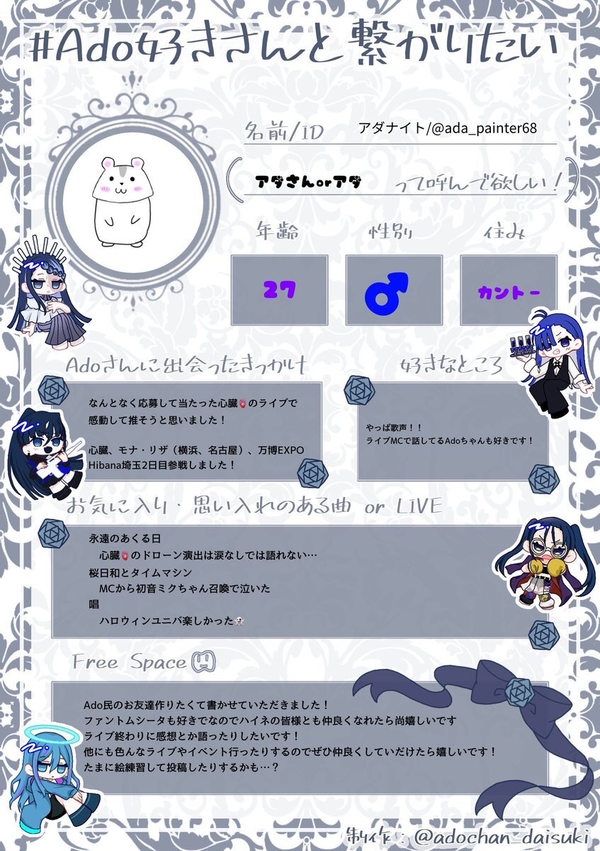 自己紹介のまとめです! 色々な界隈混ざってますが仲良くしてください!! #Ado民自己紹介カード #Ado民と繋がりたい #Ado #ハイネ自己紹介カード #ハイネ #ファントムシータ好きと繋がりたい #ファントムシータ #バンドリ履歴書 #バンドリーマーさんと繋がりたい #バンドリ pic.x.com/ZQmTKOsydV