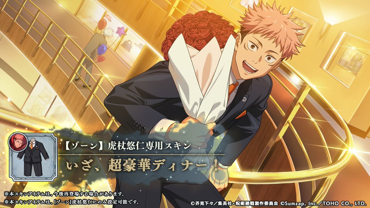 #ファンパレ1stアニバーサリー公式放送』情報⑩ SSR[ゾーン]虎杖悠仁の専用スキンとして、 [いざ、超豪華ディナー!]が登場決定! ▼視聴はこちら youtube.com/live/y2kRANttO… #ファンパレ #呪術廻戦 #ファンパレ1stアニバーサリー pic.x.com/JWP02V2F5V