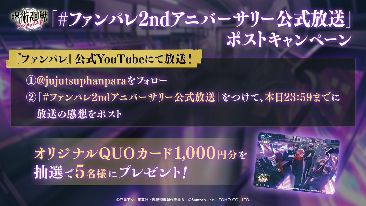 返信先:@jujutsuphanpara#ファンパレ2ndアニバーサリー公式放送 東堂葵と虎杖悠二を出してくれてありがとうございます。 これからもファントムパレードを楽しんでいこうと思いますす。