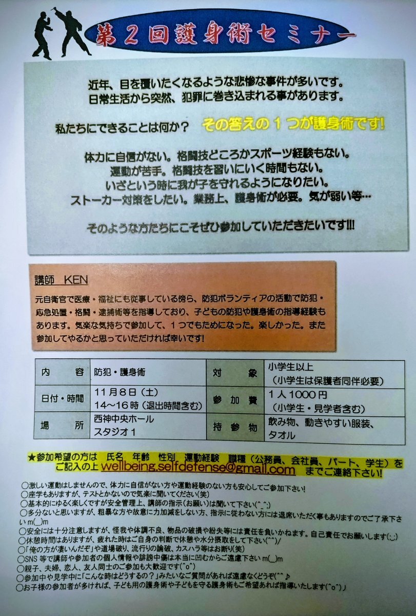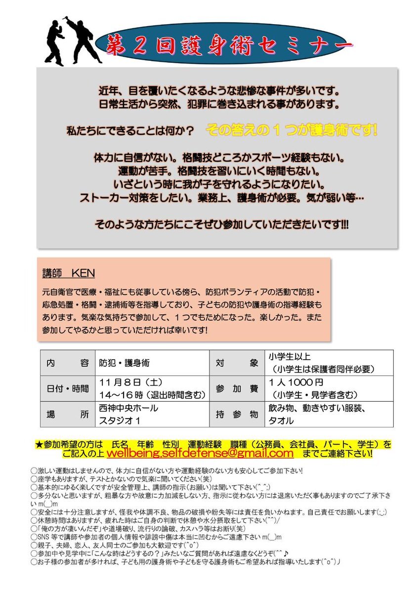 第2回護身術セミナー 11/8(土) 14〜16時 西神中央ホール スタジオ1 対象者 小学生以上〜公務員系まで 参加費 1人1000円 参加のご希望あればDMかメールに氏名・年齢(例:20代)・性別・運動経験・職種(学生、会社員、主婦、公務員など)記入お願いします🙇 ✉️wellbeing.selfdefense@gmail.com