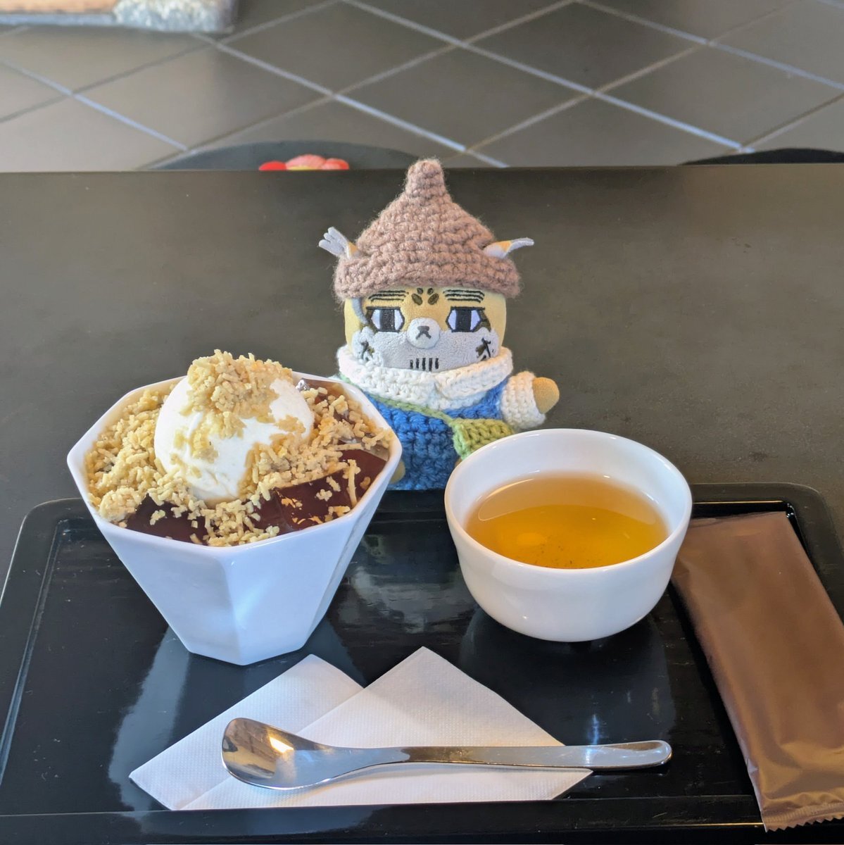 暑いですねぇ…なにか冷たいもの、と思って白玉粉で作ったきな粉餅をよく冷やして黒蜜掛けたヤツを 砂糖はレシピの半量にしたよんまかったよ☺️ きな粉餅とな~んも関係ない話で盛り上がる二人🤭 #フォゼ尾といっしょ pic.x.com/QWtZzczlLK