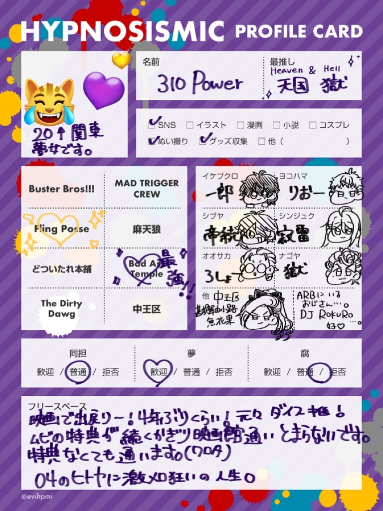 #ヒプマイ好きさんと繋がりたい #ヒプマイ好きな人と繋がりたい ムビをキメまくり再熱しました〜❤️‍🔥再熱の結果ヒトヤに落ちた実質BAT新規です💜 ぬいとアクスタを持って映画館通ってます😹 新規アカウントなのでお友達がほしいです❗️✨ ♻️♡気になる方周りま〜す❗️✌️