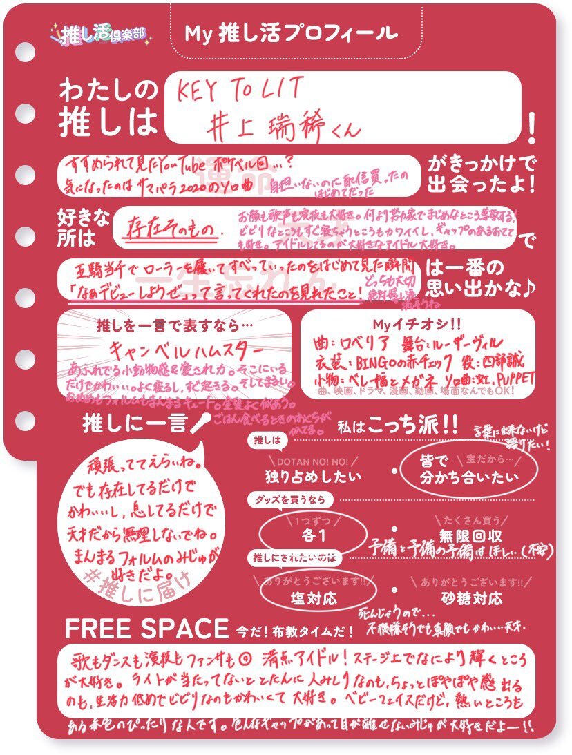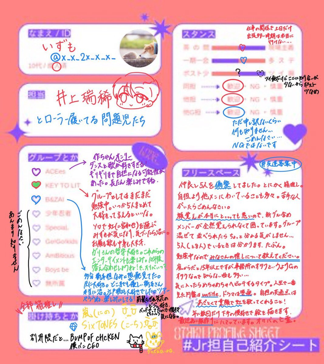 前向き亡霊の変なオタクですが、それでもよければお願いします! あまりに自己紹介が後ろ向きだったので推しって可愛い!天才!の気持ちだけで2枚目書きました() 文字数多めです💦 #Jr担自己紹介シート #フォロワーさんのフォロワーさんと繋がりたい #HiHi担と繋がりたい #キテレツ担と繋がりたい pic.x.com/IAI2n17lFh