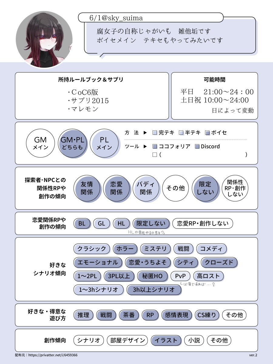 【固定用】 みんなで楽しくをもっとーに遊んでます!! TRPGメイン雑他垢です BL大好き ❤♲どちらも巡回します~! #TRPG自己紹介シート #TRPG好きと繋がりたい