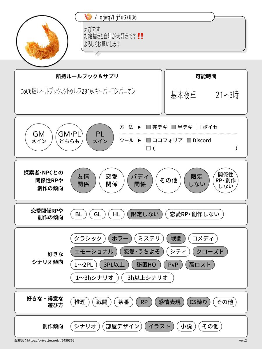 便乗&更新! ─────────── █ テキセ/CoC6版メイン █ PLメイン █ RP大好き ─────────── 対戦よろしくお願いします‼️ #TRPG自己紹介シート #フォロワーのフォロワーさんと繋がりたい pic.x.com/LwRZkk1vxo