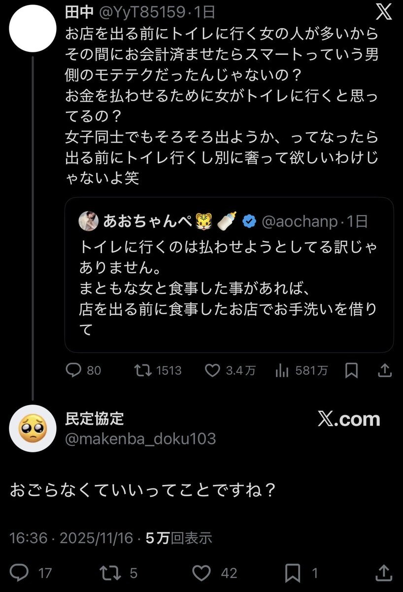 リプ欄👩🏻「女性は奢って欲しいわけじゃないよ〜でもね!奢らないってことはね!」 ↑ 奢れって真正面から言えなくてうだうだ言い出すの草 そうだよね。女性は男性が奢るべきなんて思ってないし奢って欲しいわけじゃないけど奢らない男に魅力は感じないし奢らない男と飯行く価値はないってだけだもんね x.com/makenba_doku10…
